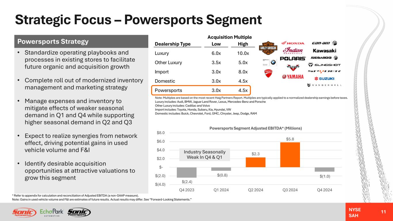 NYSE SAH Strategic Focus – EchoPark Segment (continued) 10 • Focus on maintaining positive retail used vehicle GPU throughout FY 2025 due to faster inventory turns and stability in wholesale and retail prices and used car supply • Maintain focus on optimizing F&I product offerings and pricing to drive F&I GPU growth in FY 2025 • Expect relative stability in used vehicle wholesale and retail prices in FY 2025, reducing inventory acquisition costs and potentially driving incremental industry sales volume as consumer affordability improves • Used vehicle supply is projected to reach its lowest point in late 2025, due to lower levels of off-lease inventory as a result of declines in new vehicle industry sales volume since 2020 and fewer lease originations • Beyond 2025, gradual expansion of used vehicle supply and further normalization of used vehicle pricing should drive consumer demand and higher retail sales volume for EchoPark EchoPark Strategy $10.7 $(47.8) $(105.4) $(83.0) $27.6 $(9.1) $4.2 $2,013 $1,762 $2,657 $2,183 $3,029 $2,461 $2,974 FY 2020 FY 2021 FY 2022 FY 2023 FY 2024 Q4 2023 Q4 2024 EchoPark Segment Adjusted EBITDA* and Total GPU (Used GPU + F&I GPU) Adjusted EBITDA* (Millions) Total GPU Source: J.D. Power Vehicle Age (0-5 Years) * Refer to appendix for calculation and reconciliation of Adjusted EBITDA (a non-GAAP measure). Note: F&I GPU growth, used vehicle price and supply, and sales volume projections are estimates of future results. Actual results may differ. See “Forward-Looking Statements.” 4.8 5.1 5.1 5.1 4.7 4.1 3.4 3.7 3.8 4.6 2019 2020 2021 2022 2023 2024 2025E 2026E 2027E 2028E Used Vehicle Supply Trend For Units Up To Five Years In Age 0 1 2 3 4 5 Forecast
