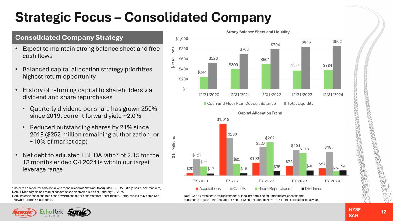 NYSE SAH 11 • Standardize operating playbooks and processes in existing stores to facilitate future organic and acquisition growth • Complete roll out of modernized inventory management and marketing strategy • Manage expenses and inventory to mitigate effects of weaker seasonal demand in Q1 and Q4 while supporting higher seasonal demand in Q2 and Q3 • Expect to realize synergies from network effect, driving potential gains in used vehicle volume and F&I • Identify desirable acquisition opportunities at attractive valuations to grow this segment Powersports Strategy Note: Multiples are based on the most recent Haig Partners Report. Multiples are typically applied to a normalized dealership earnings before taxes. Luxury includes: Audi, BMW, Jaguar Land Rover, Lexus, Mercedes-Benz and Porsche Other Luxury includes: Cadillac and Volvo Import includes: Toyota, Honda, Subaru, Kia, Hyundai, VW Domestic includes: Buick, Chevrolet, Ford, GMC, Chrysler, Jeep, Dodge, RAM Strategic Focus – Powersports Segment * Refer to appendix for calculation and reconciliation of Adjusted EBITDA (a non-GAAP measure). Note: Gains in used vehicle volume and F&I are estimates of future results. Actual results may differ. See “Forward-Looking Statements.” $(2.4) $(0.8) $2.3 $5.8 $(1.0) $(4.0) $(2.0) $- $2.0 $4.0 $6.0 $8.0 Q4 2023 Q1 2024 Q2 2024 Q3 2024 Q4 2024 Powersports Segment Adjusted EBITDA* (Millions) Industry Seasonally Weak In Q4 & Q1 Acquisition Multiple Dealership Type Low High Luxury 6.0x 10.0x Other Luxury 3.5x 5.0x Import 3.0x 8.0x Domestic 3.0x 4.5x Powersports 3.0x 4.5x