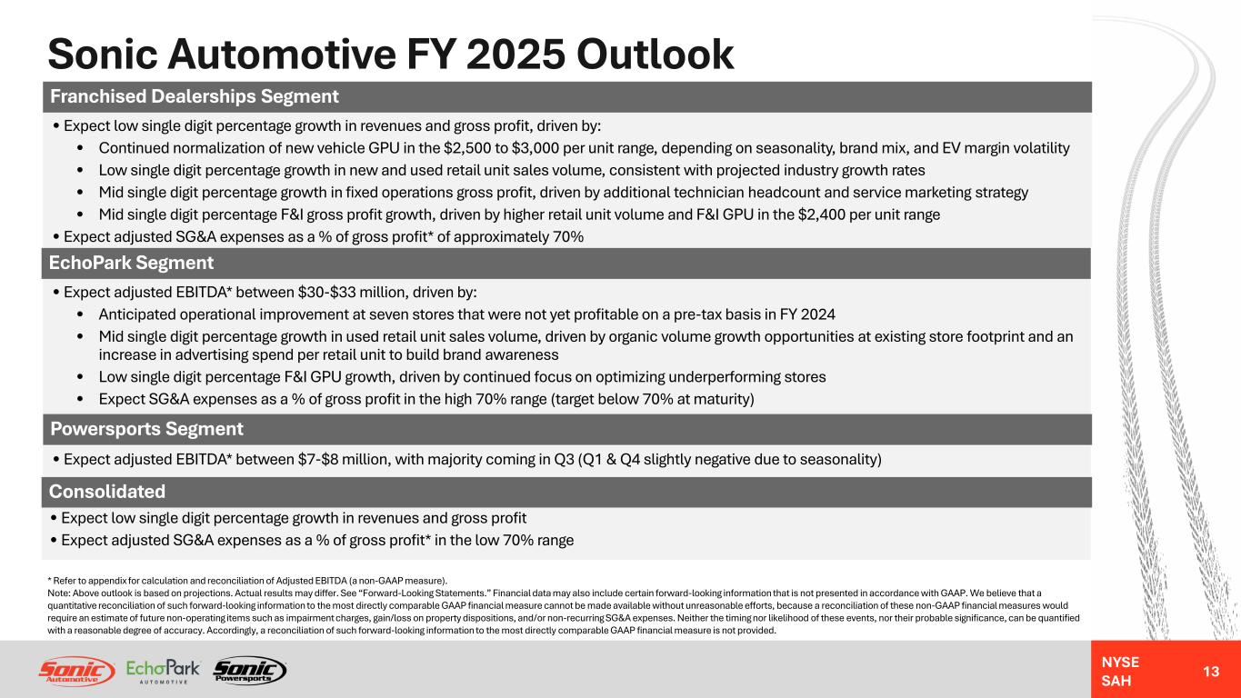 NYSE SAH Strategic Focus – Consolidated Company 12 • Expect to maintain strong balance sheet and free cash flows • Balanced capital allocation strategy prioritizes highest return opportunity • History of returning capital to shareholders via dividend and share repurchases • Quarterly dividend per share has grown 250% since 2019, current forward yield ~2.0% • Reduced outstanding shares by 21% since 2019 ($252 million remaining authorization, or ~10% of market cap) • Net debt to adjusted EBITDA ratio* of 2.15 for the 12 months ended Q4 2024 is within our target leverage range Consolidated Company Strategy $244 $399 $501 $374 $384 $526 $703 $794 $846 $862 $- $200 $400 $600 $800 $1,000 12/31/2020 12/31/2021 12/31/2022 12/31/2023 12/31/2024 $ In M ill io ns Strong Balance Sheet and Liquidity Cash and Floor Plan Deposit Balance Total Liquidity * Refer to appendix for calculation and reconciliation of Net Debt to Adjusted EBITDA Ratio (a non-GAAP measure). Note: Dividend yield and market cap are based on stock price as of February 10, 2025. Note: Balance sheet and free cash flow projections are estimates of future results. Actual results may differ. See “Forward-Looking Statements.” $20 $1,019 $102 $75 $57 $127 $298 $227 $204 $187 $72 $93 $262 $178 $34 $17 $18 $35 $40 $41 FY 2020 FY 2021 FY 2022 FY 2023 FY 2024 $ In M ill io ns Capital Allocation Trend Acquisitions Cap Ex Share Repurchases Dividends Note: Cap Ex represents total purchases of land, property and equipment from consolidated statements of cash flows included in Sonic’s Annual Report on Form 10-K for the applicable fiscal year.