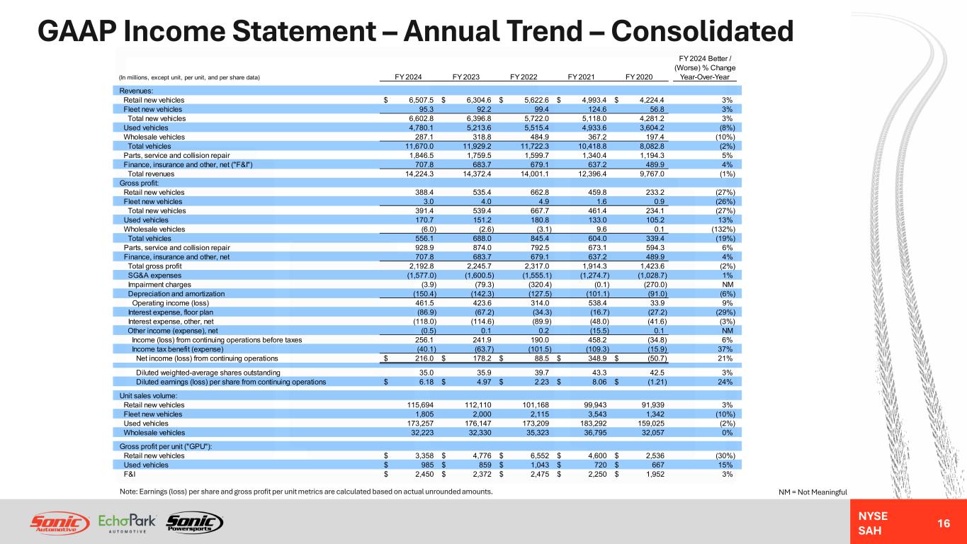 NYSE SAH Definition of Non-GAAP Financial Measures 15 Adjusted Net Income is defined as GAAP net income, excluding certain non-operating charges and/or benefits that may affect the comparability of results from period to period. Adjusted Earnings Per Diluted Share (“Adjusted EPS”) is defined as Adjusted Net Income divided by diluted weighted-average common shares outstanding. Segment Income (Loss) is defined as segment income (loss) before taxes, less impairment charges. Adjusted Segment Income (Loss) is defined as Segment Income (Loss), excluding certain non- operating charges and/or benefits that may affect the comparability of results from period to period. Adjusted Gross Profit is defined as GAAP gross profit, excluding certain non-operating charges that may affect the comparability of results from period to period. Adjusted SG&A Expenses is defined as GAAP SG&A expenses, excluding certain non-operating charges and/or benefits that may affect the comparability of results from period to period. Adjusted SG&A Expenses as a % of Gross Profit is defined as GAAP SG&A expenses, excluding certain non-operating charges and/or benefits that may affect the comparability of results from period to period, expressed as a percentage of adjusted gross profit. Adjusted EBITDA is defined as GAAP net income (loss), excluding the provision for income taxes, non-floor plan interest expense, depreciation and amortization expense, stock-based compensation expense, and certain non-operating charges and/or benefits that may affect the comparability of results from period to period. Segment Adjusted EBITDA and Segment Adjusted EBITDA Loss is defined as segment income (loss) before taxes, excluding non-floor plan interest expense, depreciation and amortization expense, stock-based compensation expense, and certain non-operating charges and/or benefits that may affect the comparability of results from period to period. Net Debt to Adjusted EBITDA Ratio is defined as long-term debt (including current portion), less cash and equivalents, less outstanding floor plan deposit balance, expressed as a ratio to Adjusted EBITDA. To supplement the Company’s financial data presented in accordance with accounting principles generally accepted in the United States (“GAAP”), this presentation contains certain non- GAAP financial measures, such as adjusted net income, adjusted earnings per diluted share, segment income (loss), adjusted segment income (loss), adjusted SG&A expenses as a percentage of gross profit, adjusted EBITDA, adjusted EBITDA loss, and net debt to adjusted EBITDA ratio. The Company has provided reconciliations of these non-GAAP financial measures to the most directly comparable GAAP financial measures in the appendix to this presentation. Management believes that these non-GAAP financial measures are important supplemental measures of performance which improve the comparability and transparency of the Company’s disclosures and provide a meaningful presentation of the Company’s results. Management also considers these non-GAAP financial measures when making financial, operating and strategic decisions. Financial data may also include certain forward-looking information that is not presented in accordance with GAAP. We believe that a quantitative reconciliation of such forward-looking information to the most directly comparable GAAP financial measure cannot be made available without unreasonable efforts, because a reconciliation of these non-GAAP financial measures would require an estimate of future non-operating items such as impairment charges, gain/loss on property dispositions, and/or non-recurring SG&A expenses. Neither the timing nor likelihood of these events, nor their probable significance, can be quantified with a reasonable degree of accuracy. Accordingly, a reconciliation of such forward-looking information to the most directly comparable GAAP financial measure is not provided.