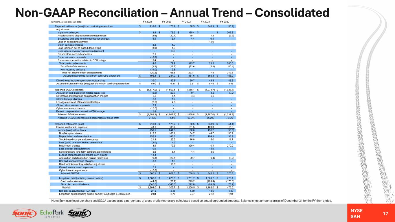 NYSE SAH GAAP Income Statement – Annual Trend – Consolidated 16 NM = Not MeaningfulNote: Earnings (loss) per share and gross profit per unit metrics are calculated based on actual unrounded amounts. FY 2024 Better / (Worse) % Change (In millions, except unit, per unit, and per share data) FY 2024 FY 2023 FY 2022 FY 2021 FY 2020 Year-Over-Year Revenues: Retail new vehicles 6,507.5$ 6,304.6$ 5,622.6$ 4,993.4$ 4,224.4$ 3% Fleet new vehicles 95.3 92.2 99.4 124.6 56.8 3% Total new vehicles 6,602.8 6,396.8 5,722.0 5,118.0 4,281.2 3% Used vehicles 4,780.1 5,213.6 5,515.4 4,933.6 3,604.2 (8%) Wholesale vehicles 287.1 318.8 484.9 367.2 197.4 (10%) Total vehicles 11,670.0 11,929.2 11,722.3 10,418.8 8,082.8 (2%) Parts, service and collision repair 1,846.5 1,759.5 1,599.7 1,340.4 1,194.3 5% Finance, insurance and other, net ("F&I") 707.8 683.7 679.1 637.2 489.9 4% Total revenues 14,224.3 14,372.4 14,001.1 12,396.4 9,767.0 (1%) Gross profit: Retail new vehicles 388.4 535.4 662.8 459.8 233.2 (27%) Fleet new vehicles 3.0 4.0 4.9 1.6 0.9 (26%) Total new vehicles 391.4 539.4 667.7 461.4 234.1 (27%) Used vehicles 170.7 151.2 180.8 133.0 105.2 13% Wholesale vehicles (6.0) (2.6) (3.1) 9.6 0.1 (132%) Total vehicles 556.1 688.0 845.4 604.0 339.4 (19%) Parts, service and collision repair 928.9 874.0 792.5 673.1 594.3 6% Finance, insurance and other, net 707.8 683.7 679.1 637.2 489.9 4% Total gross profit 2,192.8 2,245.7 2,317.0 1,914.3 1,423.6 (2%) SG&A expenses (1,577.0) (1,600.5) (1,555.1) (1,274.7) (1,028.7) 1% Impairment charges (3.9) (79.3) (320.4) (0.1) (270.0) NM Depreciation and amortization (150.4) (142.3) (127.5) (101.1) (91.0) (6%) Operating income (loss) 461.5 423.6 314.0 538.4 33.9 9% Interest expense, floor plan (86.9) (67.2) (34.3) (16.7) (27.2) (29%) Interest expense, other, net (118.0) (114.6) (89.9) (48.0) (41.6) (3%) Other income (expense), net (0.5) 0.1 0.2 (15.5) 0.1 NM Income (loss) from continuing operations before taxes 256.1 241.9 190.0 458.2 (34.8) 6% Income tax benefit (expense) (40.1) (63.7) (101.5) (109.3) (15.9) 37% Net income (loss) from continuing operations 216.0$ 178.2$ 88.5$ 348.9$ (50.7)$ 21% Diluted weighted-average shares outstanding 35.0 35.9 39.7 43.3 42.5 3% Diluted earnings (loss) per share from continuing operations 6.18$ 4.97$ 2.23$ 8.06$ (1.21)$ 24% Unit sales volume: Retail new vehicles 115,694 112,110 101,168 99,943 91,939 3% Fleet new vehicles 1,805 2,000 2,115 3,543 1,342 (10%) Used vehicles 173,257 176,147 173,209 183,292 159,025 (2%) Wholesale vehicles 32,223 32,330 35,323 36,795 32,057 0% Gross profit per unit ("GPU"): Retail new vehicles 3,358$ 4,776$ 6,552$ 4,600$ 2,536$ (30%) Used vehicles 985$ 859$ 1,043$ 720$ 667$ 15% F&I 2,450$ 2,372$ 2,475$ 2,250$ 1,952$ 3%