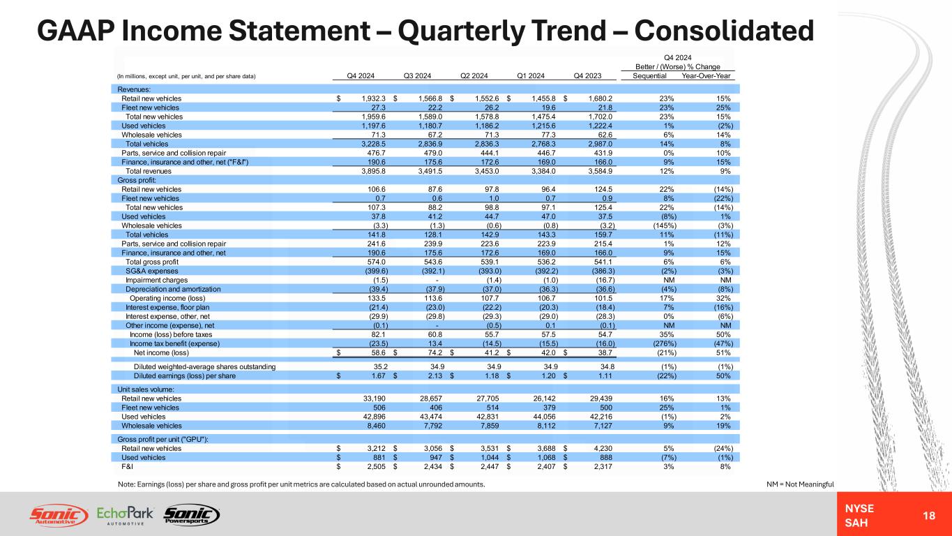 NYSE SAH Non-GAAP Reconciliation – Annual Trend – Consolidated 17 Note: Earnings (loss) per share and SG&A expenses as a percentage of gross profit metrics are calculated based on actual unrounded amounts. Balance sheet amounts are as of December 31 for the FY then ended. (In millions, except per share data) FY 2024 FY 2023 FY 2022 FY 2021 FY 2020 Reported net income (loss) from continuing operations 216.0$ 178.2$ 88.5$ 348.9$ (50.7)$ Adjustments: Impairment charges 3.9$ 79.3$ 320.4$ -$ 269.2$ Acquisition and disposition-related (gain) loss (5.6) (20.7) (9.1) 1.2 (9.2) Severance and long-term compensation charges 5.5 5.1 4.4 6.5 - Loss on debt extinguishment - - - 15.6 - Storm damage charges 8.3 1.9 - - - Loss (gain) on exit of leased dealerships (3.0) 4.3 - - - Used vehicle inventory valuation adjustment - 10.0 - - - Closed store accrued expenses 2.1 - - - - Cyber insurance proceeds (10.0) - - - - Excess compensation related to CDK outage 13.4 - - - - Total pre-tax adjustments 14.6 79.9 315.7 23.3 260.0 Tax effect of above items (3.8) (19.9) (22.6) (5.9) (40.4) Non-recurring tax items (31.0) 5.8 - - - Total net income effect of adjustments (20.2) 65.8 293.1 17.4 219.6 Adjusted net income (loss) from continuing operations 195.8$ 244.0$ 381.6$ 366.3$ 168.9$ Diluted weighted-average shares outstanding 35.0 35.9 39.7 43.3 43.9 Adjusted diluted earnings (loss) per share from continuing operations 5.60$ 6.81$ 9.61$ 8.46$ 3.85$ Reported SG&A expenses (1,577.0)$ (1,600.5)$ (1,555.1)$ (1,274.7)$ (1,028.7)$ Acquisition and disposition-related (gain) loss (5.6) (20.7) (9.1) 1.2 (9.2) Severance and long-term compensation charges 5.5 5.1 4.4 6.5 - Storm damage charges 8.3 1.9 - - - Loss (gain) on exit of leased dealerships (3.0) 4.3 - - - Closed store accrued expenses 2.1 - - - - Cyber insurance proceeds (10.0) - - - - Excess compensation related to CDK outage 11.4 - - - - Adjusted SG&A expenses (1,568.3)$ (1,609.9)$ (1,559.8)$ (1,267.0)$ (1,037.9)$ Adjusted SG&A expenses as a percentage of gross profit 71.5% 71.4% 67.3% 66.2% 72.9% Reported net income (loss) 216.0$ 178.2$ 88.5$ 348.9$ (51.4)$ Income tax (benefit) expense 40.1 63.7 101.5 109.3 15.6 Income (loss) before taxes 256.1 241.9 190.0 458.2 (35.8) Non-floor plan interest 112.2 108.1 84.7 44.7 38.7 Depreciation and amortization 155.9 148.8 132.7 104.3 93.9 Stock-based compensation expense 21.3 23.3 16.0 15.0 11.7 Loss (gain) on exit of leased dealerships (3.0) 4.3 - - - Impairment charges 3.9 79.3 320.4 0.1 270.0 Loss on debt extinguishment 0.6 - - 15.6 - Severance and long-term compensation charges 5.6 5.1 4.4 8.0 - Excess compensation related to CDK outage 13.4 - - - - Acquisition and disposition-related (gain) loss (6.3) (20.4) (9.7) (0.4) (8.2) Hail and storm damage charges 8.3 1.9 - - - Used vehicle inventory valuation adjustment - 10.0 - - - Closed store accrued expenses 2.1 - - - - Cyber insurance proceeds (10.0) - - - - Adjusted EBITDA 560.1$ 602.3$ 738.5$ 645.5$ 370.3$ Long-term debt (including current portion) 1,588.0$ 1,676.6$ 1,751.7$ 1,561.2$ 720.1$ Cash and equivalents (44.0) (28.9) (229.2) (299.4) (170.3) Floor plan deposit balance (340.0) (345.0) (272.0) (99.8) (73.2) Net debt 1,204.0$ 1,302.7$ 1,250.5$ 1,162.0$ 476.6$ Net debt to adjusted EBITDA ratio 2.15 2.16 1.69 1.80 1.29 Long-term debt (including current portion) to adjusted EBITDA ratio 2.84 2.78 2.37 2.42 1.94