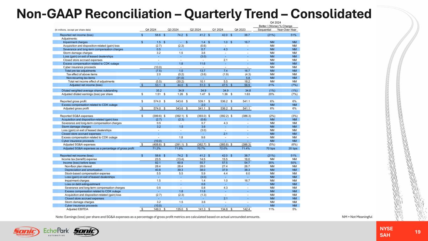 NYSE SAH GAAP Income Statement – Quarterly Trend – Consolidated 18 NM = Not MeaningfulNote: Earnings (loss) per share and gross profit per unit metrics are calculated based on actual unrounded amounts. Q4 2024 Better / (Worse) % Change (In millions, except unit, per unit, and per share data) Q4 2024 Q3 2024 Q2 2024 Q1 2024 Q4 2023 Sequential Year-Over-Year Revenues: Retail new vehicles 1,932.3$ 1,566.8$ 1,552.6$ 1,455.8$ 1,680.2$ 23% 15% Fleet new vehicles 27.3 22.2 26.2 19.6 21.8 23% 25% Total new vehicles 1,959.6 1,589.0 1,578.8 1,475.4 1,702.0 23% 15% Used vehicles 1,197.6 1,180.7 1,186.2 1,215.6 1,222.4 1% (2%) Wholesale vehicles 71.3 67.2 71.3 77.3 62.6 6% 14% Total vehicles 3,228.5 2,836.9 2,836.3 2,768.3 2,987.0 14% 8% Parts, service and collision repair 476.7 479.0 444.1 446.7 431.9 0% 10% Finance, insurance and other, net ("F&I") 190.6 175.6 172.6 169.0 166.0 9% 15% Total revenues 3,895.8 3,491.5 3,453.0 3,384.0 3,584.9 12% 9% Gross profit: Retail new vehicles 106.6 87.6 97.8 96.4 124.5 22% (14%) Fleet new vehicles 0.7 0.6 1.0 0.7 0.9 8% (22%) Total new vehicles 107.3 88.2 98.8 97.1 125.4 22% (14%) Used vehicles 37.8 41.2 44.7 47.0 37.5 (8%) 1% Wholesale vehicles (3.3) (1.3) (0.6) (0.8) (3.2) (145%) (3%) Total vehicles 141.8 128.1 142.9 143.3 159.7 11% (11%) Parts, service and collision repair 241.6 239.9 223.6 223.9 215.4 1% 12% Finance, insurance and other, net 190.6 175.6 172.6 169.0 166.0 9% 15% Total gross profit 574.0 543.6 539.1 536.2 541.1 6% 6% SG&A expenses (399.6) (392.1) (393.0) (392.2) (386.3) (2%) (3%) Impairment charges (1.5) - (1.4) (1.0) (16.7) NM NM Depreciation and amortization (39.4) (37.9) (37.0) (36.3) (36.6) (4%) (8%) Operating income (loss) 133.5 113.6 107.7 106.7 101.5 17% 32% Interest expense, floor plan (21.4) (23.0) (22.2) (20.3) (18.4) 7% (16%) Interest expense, other, net (29.9) (29.8) (29.3) (29.0) (28.3) 0% (6%) Other income (expense), net (0.1) - (0.5) 0.1 (0.1) NM NM Income (loss) before taxes 82.1 60.8 55.7 57.5 54.7 35% 50% Income tax benefit (expense) (23.5) 13.4 (14.5) (15.5) (16.0) (276%) (47%) Net income (loss) 58.6$ 74.2$ 41.2$ 42.0$ 38.7$ (21%) 51% Diluted weighted-average shares outstanding 35.2 34.9 34.9 34.9 34.8 (1%) (1%) Diluted earnings (loss) per share 1.67$ 2.13$ 1.18$ 1.20$ 1.11$ (22%) 50% Unit sales volume: Retail new vehicles 33,190 28,657 27,705 26,142 29,439 16% 13% Fleet new vehicles 506 406 514 379 500 25% 1% Used vehicles 42,896 43,474 42,831 44,056 42,216 (1%) 2% Wholesale vehicles 8,460 7,792 7,859 8,112 7,127 9% 19% Gross profit per unit ("GPU"): Retail new vehicles 3,212$ 3,056$ 3,531$ 3,688$ 4,230$ 5% (24%) Used vehicles 881$ 947$ 1,044$ 1,068$ 888$ (7%) (1%) F&I 2,505$ 2,434$ 2,447$ 2,407$ 2,317$ 3% 8%