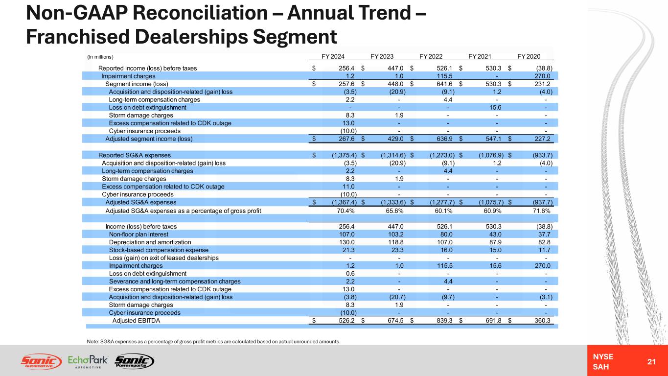 NYSE SAH GAAP Income Statement – Annual Trend – Franchised Dealerships Segment 20 NM = Not MeaningfulNote: Gross profit per unit metrics are calculated based on actual unrounded amounts. FY 2024 Better / (Worse) % Change (In millions, except unit and per unit data) FY 2024 FY 2023 FY 2022 FY 2021 FY 2020 Year-Over-Year Revenues: Retail new vehicles 6,425.5$ 6,215.0$ 5,581.6$ 4,984.4$ 4,224.4$ 3% Fleet new vehicles 95.3 92.2 99.4 124.6 56.8 3% Total new vehicles 6,520.8 6,307.2 5,681.0 5,109.0 4,281.2 3% Used vehicles 2,919.8 3,050.3 3,391.5 2,901.0 2,345.9 (4%) Wholesale vehicles 188.9 204.5 314.0 257.2 168.7 (8%) Total vehicles 9,629.5 9,562.0 9,386.5 8,267.2 6,795.8 1% Parts, service and collision repair 1,802.9 1,714.2 1,588.0 1,340.4 1,194.4 5% Finance, insurance and other, net ("F&I") 506.8 498.6 510.1 443.5 357.8 2% Total revenues 11,939.2 11,774.8 11,484.6 10,051.1 8,348.0 1% Gross profit: Retail new vehicles 376.9 518.7 655.3 458.8 233.2 (27%) Fleet new vehicles 3.0 4.0 4.9 1.5 0.9 (26%) Total new vehicles 379.9 522.7 660.2 460.3 234.1 (27%) Used vehicles 150.2 162.9 174.5 188.1 122.9 (8%) Wholesale vehicles (4.6) (3.3) (6.4) 0.6 (0.8) (40%) Total vehicles 525.5 682.3 828.3 649.0 356.2 (23%) Parts, service and collision repair 908.9 852.7 786.7 673.1 595.4 7% Finance, insurance and other, net 506.8 498.6 510.1 443.5 357.8 2% Total gross profit 1,941.2 2,033.6 2,125.1 1,765.6 1,309.4 (5%) SG&A expenses (1,375.4) (1,314.6) (1,273.0) (1,076.9) (933.7) (5%) Impairment charges (1.2) (1.0) (115.5) - (270.0) NM Depreciation and amortization (124.4) (112.3) (101.8) (84.8) (79.9) (11%) Operating income (loss) 440.2 605.7 634.8 603.9 25.8 (27%) Interest expense, floor plan (70.6) (49.2) (23.6) (11.8) (24.0) (44%) Interest expense, other, net (112.7) (109.7) (85.1) (46.3) (40.7) (3%) Other income (expense), net (0.5) 0.2 - (15.5) 0.1 NM Income (loss) before taxes 256.4$ 447.0$ 526.1$ 530.3$ (38.8)$ (43%) Unit sales volume: Retail new vehicles 111,450 107,257 99,424 99,815 91,939 4% Fleet new vehicles 1,805 2,000 2,115 3,543 1,342 (10%) Used vehicles 101,976 100,210 108,512 105,457 101,864 2% Wholesale vehicles 21,018 20,602 24,052 25,128 24,879 2% Gross profit per unit ("GPU"): Retail new vehicles 3,382$ 4,836$ 6,591$ 4,595$ 2,536$ (30%) Used vehicles 1,473$ 1,626$ 1,607$ 1,784$ 1,207$ (9%) F&I 2,374$ 2,403$ 2,453$ 2,160$ 1,846$ (1%)