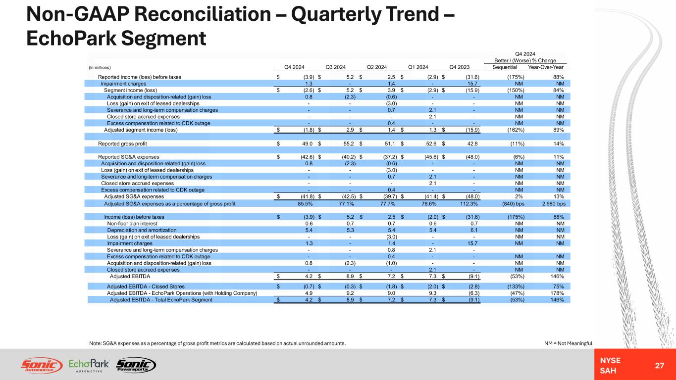 NYSE SAH GAAP Income Statement – Quarterly Trend – EchoPark Segment 26 NM = Not MeaningfulNote: Gross profit per unit metrics are calculated based on actual unrounded amounts. Q4 2024 Better / (Worse) % Change (In millions, except unit and per unit data) Q4 2024 Q3 2024 Q2 2024 Q1 2024 Q4 2023 Sequential Year-Over-Year Revenues: Used vehicles 436.0$ 470.3$ 448.9$ 482.9$ 492.5$ (7%) (11%) Wholesale vehicles 21.4 23.8 21.9 28.6 22.6 (10%) (5%) Total vehicles 457.4 494.1 470.8 511.5 515.1 (7%) (11%) Finance, insurance and other, net ("F&I") 48.8 50.8 46.5 47.9 41.5 (4%) 18% Total revenues 506.2 544.9 517.3 559.4 556.6 (7%) (9%) Gross profit: Used vehicles 0.8 4.4 4.7 5.3 1.7 (82%) (53%) Wholesale vehicles (0.6) 0.0 (0.1) (0.6) (0.4) (2055%) (50%) Total vehicles 0.2 4.4 4.6 4.7 1.3 (95%) (85%) Finance, insurance and other, net 48.8 50.8 46.5 47.9 41.5 (4%) 18% Total gross profit 49.0 55.2 51.1 52.6 42.8 (11%) 14% SG&A expenses (42.6) (40.2) (37.2) (45.6) (48.0) (6%) 11% Impairment charges (1.3) - (1.4) - (15.7) NM NM Depreciation and amortization (5.4) (5.4) (5.6) (5.5) (6.2) (1%) 13% Operating income (loss) (0.3) 9.6 6.9 1.5 (27.1) (103%) 99% Interest expense, floor plan (3.0) (3.7) (3.8) (3.8) (3.8) 19% 21% Interest expense, other, net (0.7) (0.7) (0.7) (0.7) (0.7) 0% 0% Other income (expense), net 0.1 - 0.1 0.1 - NM NM Income (loss) before taxes (3.9)$ 5.2$ 2.5$ (2.9)$ (31.6)$ (175%) 88% Unit sales volume: Used vehicles 16,674 17,757 16,641 17,981 17,562 (6%) (5%) Wholesale vehicles 2,752 2,720 2,593 2,994 2,621 1% 5% Gross profit per unit ("GPU"): Total used vehicle and F&I 2,974$ 3,111$ 3,078$ 2,955$ 2,461$ (4%) 21%