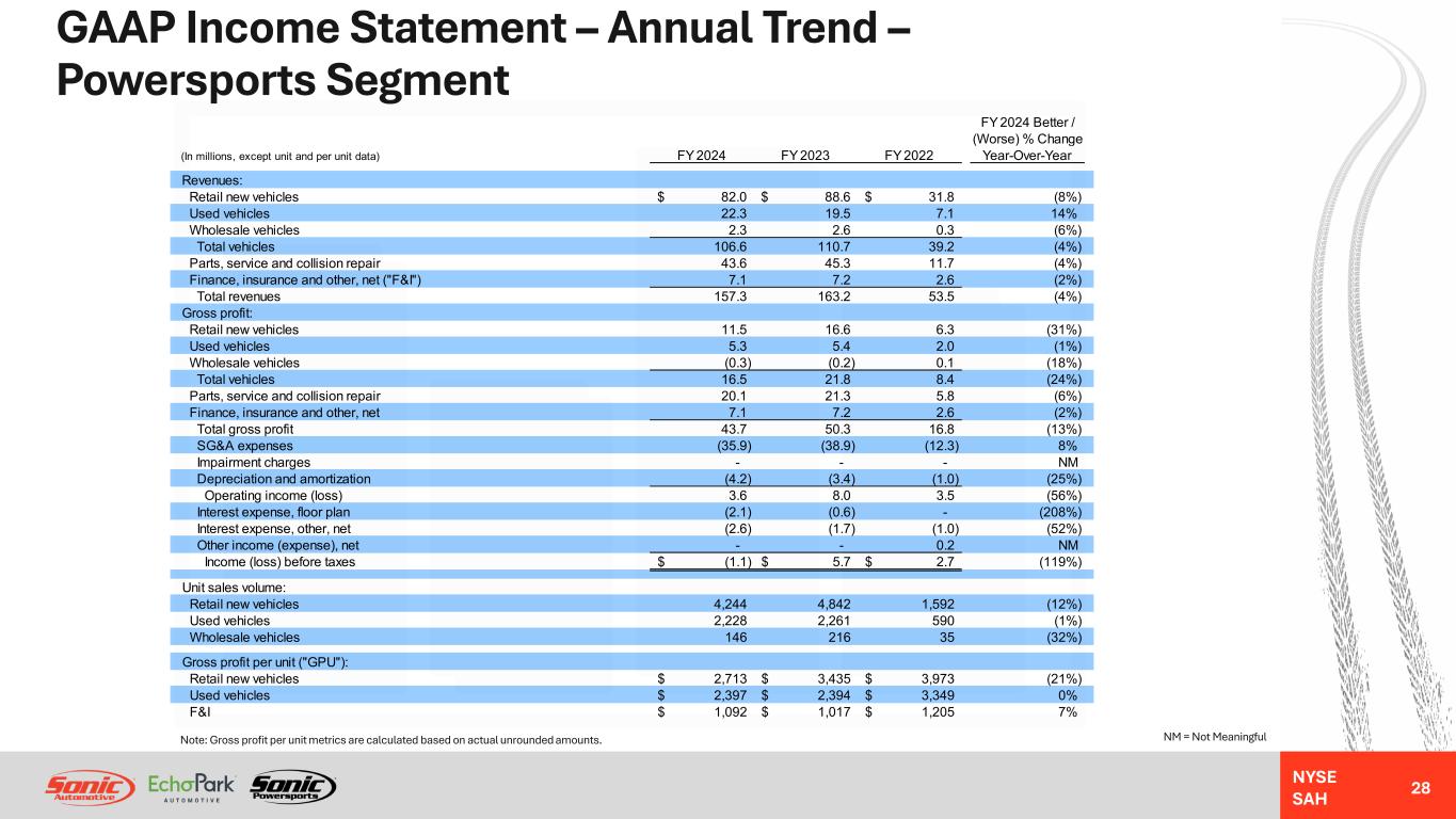 NYSE SAH Non-GAAP Reconciliation – Quarterly Trend – EchoPark Segment 27 NM = Not MeaningfulNote: SG&A expenses as a percentage of gross profit metrics are calculated based on actual unrounded amounts. Q4 2024 Better / (Worse) % Change (In millions) Q4 2024 Q3 2024 Q2 2024 Q1 2024 Q4 2023 Sequential Year-Over-Year Reported income (loss) before taxes (3.9)$ 5.2$ 2.5$ (2.9)$ (31.6)$ (175%) 88% Impairment charges 1.3 - 1.4 - 15.7 NM NM Segment income (loss) (2.6)$ 5.2$ 3.9$ (2.9)$ (15.9)$ (150%) 84% Acquisition and disposition-related (gain) loss 0.8 (2.3) (0.6) - - NM NM Loss (gain) on exit of leased dealerships - - (3.0) - - NM NM Severance and long-term compensation charges - - 0.7 2.1 - NM NM Closed store accrued expenses - - - 2.1 - NM NM Excess compensation related to CDK outage - - 0.4 - - NM NM Adjusted segment income (loss) (1.8)$ 2.9$ 1.4$ 1.3$ (15.9)$ (162%) 89% Reported gross profit 49.0$ 55.2$ 51.1$ 52.6$ 42.8$ (11%) 14% Reported SG&A expenses (42.6)$ (40.2)$ (37.2)$ (45.6)$ (48.0)$ (6%) 11% Acquisition and disposition-related (gain) loss 0.8 (2.3) (0.6) - - NM NM Loss (gain) on exit of leased dealerships - - (3.0) - - NM NM Severance and long-term compensation charges - - 0.7 2.1 - NM NM Closed store accrued expenses - - - 2.1 - NM NM Excess compensation related to CDK outage - - 0.4 - - NM NM Adjusted SG&A expenses (41.8)$ (42.5)$ (39.7)$ (41.4)$ (48.0)$ 2% 13% Adjusted SG&A expenses as a percentage of gross profit 85.5% 77.1% 77.7% 78.6% 112.3% (840) bps 2,680 bps Income (loss) before taxes (3.9)$ 5.2$ 2.5$ (2.9)$ (31.6)$ (175%) 88% Non-floor plan interest 0.6 0.7 0.7 0.6 0.7 NM NM Depreciation and amortization 5.4 5.3 5.4 5.4 6.1 NM NM Loss (gain) on exit of leased dealerships - - (3.0) - - NM NM Impairment charges 1.3 - 1.4 - 15.7 NM NM Severance and long-term compensation charges - - 0.8 2.1 - Excess compensation related to CDK outage - - 0.4 - - NM NM Acquisition and disposition-related (gain) loss 0.8 (2.3) (1.0) - - NM NM Closed store accrued expenses - - - 2.1 - NM NM Adjusted EBITDA 4.2$ 8.9$ 7.2$ 7.3$ (9.1)$ (53%) 146% Adjusted EBITDA - Closed Stores (0.7)$ (0.3)$ (1.8)$ (2.0)$ (2.8)$ (133%) 75% Adjusted EBITDA - EchoPark Operations (with Holding Company) 4.9 9.2 9.0 9.3 (6.3) (47%) 178% Adjusted EBITDA - Total EchoPark Segment 4.2$ 8.9$ 7.2$ 7.3$ (9.1)$ (53%) 146%