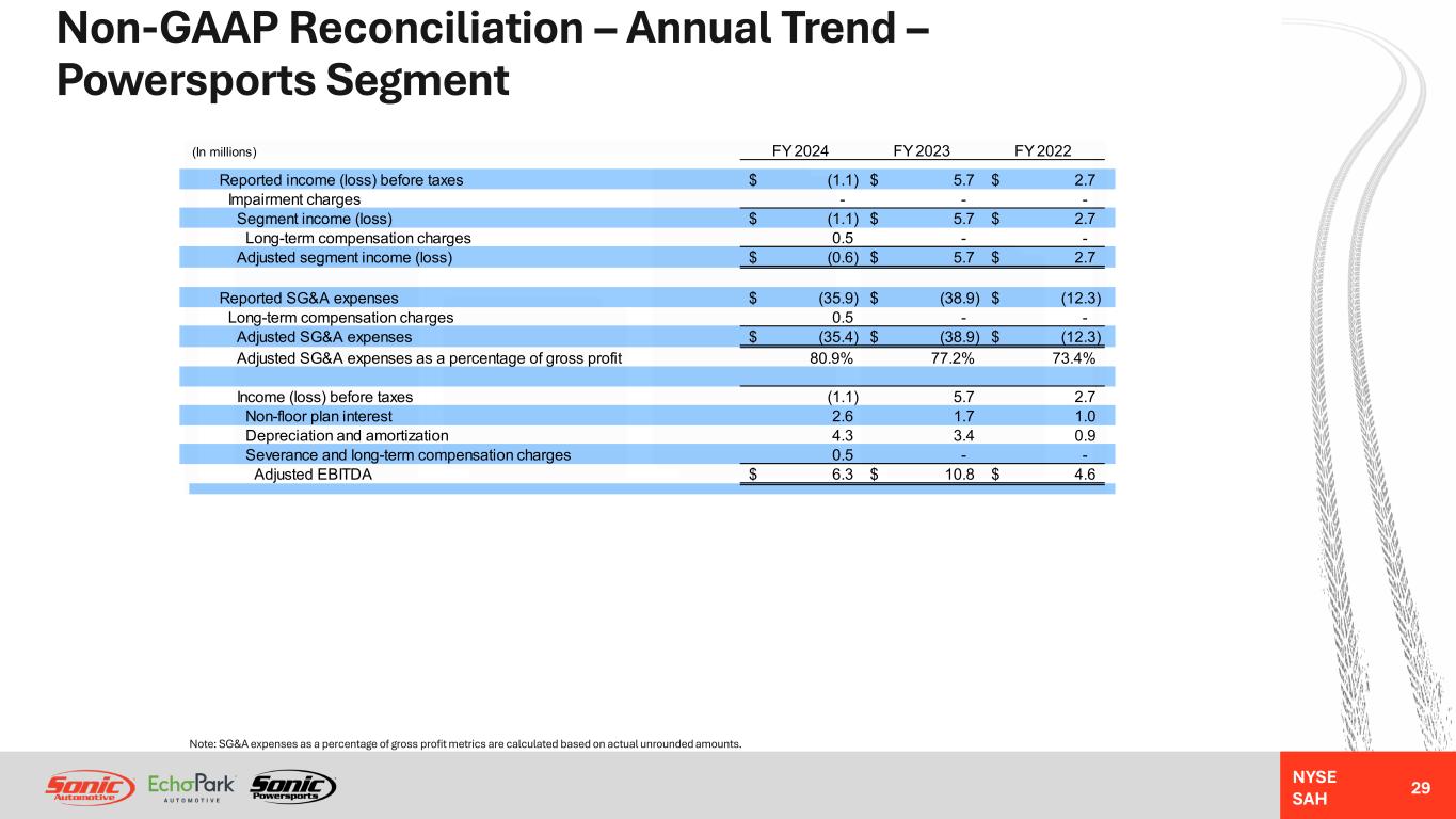 NYSE SAH GAAP Income Statement – Annual Trend – Powersports Segment 28 NM = Not MeaningfulNote: Gross profit per unit metrics are calculated based on actual unrounded amounts. FY 2024 Better / (Worse) % Change (In millions, except unit and per unit data) FY 2024 FY 2023 FY 2022 Year-Over-Year Revenues: Retail new vehicles 82.0$ 88.6$ 31.8$ (8%) Used vehicles 22.3 19.5 7.1 14% Wholesale vehicles 2.3 2.6 0.3 (6%) Total vehicles 106.6 110.7 39.2 (4%) Parts, service and collision repair 43.6 45.3 11.7 (4%) Finance, insurance and other, net ("F&I") 7.1 7.2 2.6 (2%) Total revenues 157.3 163.2 53.5 (4%) Gross profit: Retail new vehicles 11.5 16.6 6.3 (31%) Used vehicles 5.3 5.4 2.0 (1%) Wholesale vehicles (0.3) (0.2) 0.1 (18%) Total vehicles 16.5 21.8 8.4 (24%) Parts, service and collision repair 20.1 21.3 5.8 (6%) Finance, insurance and other, net 7.1 7.2 2.6 (2%) Total gross profit 43.7 50.3 16.8 (13%) SG&A expenses (35.9) (38.9) (12.3) 8% Impairment charges - - - NM Depreciation and amortization (4.2) (3.4) (1.0) (25%) Operating income (loss) 3.6 8.0 3.5 (56%) Interest expense, floor plan (2.1) (0.6) - (208%) Interest expense, other, net (2.6) (1.7) (1.0) (52%) Other income (expense), net - - 0.2 NM Income (loss) before taxes (1.1)$ 5.7$ 2.7$ (119%) Unit sales volume: Retail new vehicles 4,244 4,842 1,592 (12%) Used vehicles 2,228 2,261 590 (1%) Wholesale vehicles 146 216 35 (32%) Gross profit per unit ("GPU"): Retail new vehicles 2,713$ 3,435$ 3,973$ (21%) Used vehicles 2,397$ 2,394$ 3,349$ 0% F&I 1,092$ 1,017$ 1,205$ 7%