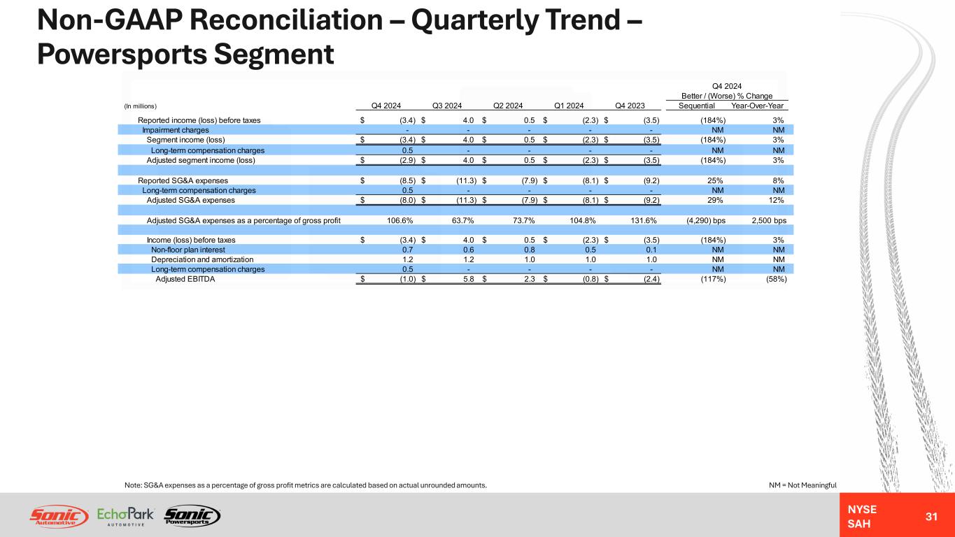 NYSE SAH GAAP Income Statement – Quarterly Trend – Powersports Segment 30 NM = Not MeaningfulNote: Gross profit per unit metrics are calculated based on actual unrounded amounts. Q4 2024 Better / (Worse) % Change (In millions, except unit and per unit data) Q4 2024 Q3 2024 Q2 2024 Q1 2024 Q4 2023 Sequential Year-Over-Year Revenues: Retail new vehicles 17.5$ 26.9$ 21.7$ 15.9$ 16.1$ (35%) 9% Used vehicles 4.7 9.0 5.3 3.4 2.4 (48%) 96% Wholesale vehicles 0.1 1.1 0.9 0.1 0.7 NM NM Total vehicles 22.3 37.0 27.9 19.4 19.2 (40%) 16% Parts, service and collision repair 7.0 20.1 9.7 6.8 6.7 (65%) 4% Finance, insurance and other, net ("F&I") 1.3 2.3 2.0 1.5 1.3 (44%) 0% Total revenues 30.6 59.4 39.6 27.7 27.2 (48%) 13% Gross profit: Retail new vehicles 2.2 4.1 2.9 2.3 2.3 (47%) (4%) Used vehicles 1.0 2.2 1.3 0.9 0.7 (54%) 43% Wholesale vehicles (0.1) (0.1) (0.1) - (0.1) NM NM Total vehicles 3.1 6.2 4.1 3.2 2.9 (50%) 7% Parts, service and collision repair 3.1 9.2 4.6 3.1 2.8 (66%) 11% Finance, insurance and other, net 1.3 2.3 2.0 1.5 1.3 (44%) 0% Total gross profit 7.5 17.7 10.7 7.8 7.0 (58%) 7% SG&A expenses (8.5) (11.3) (7.9) (8.1) (9.2) 25% 8% Impairment charges - - - - - NM NM Depreciation and amortization (1.2) (1.1) (1.0) (1.0) (1.0) (7%) (20%) Operating income (loss) (2.2) 5.3 1.8 (1.3) (3.2) (142%) 31% Interest expense, floor plan (0.5) (0.6) (0.5) (0.5) - 21% 100% Interest expense, other, net (0.7) (0.6) (0.8) (0.5) (0.2) (15%) (250%) Other income (expense), net - (0.1) - - (0.1) NM NM Income (loss) before taxes (3.4)$ 4.0$ 0.5$ (2.3)$ (3.5)$ (184%) 3% Unit sales volume: Retail new vehicles 940 1,266 1,193 845 948 (26%) (1%) Used vehicles 520 777 522 409 289 (33%) 80% Wholesale vehicles 16 99 18 13 66 NM NM Gross profit per unit ("GPU"): Retail new vehicles 2,338$ 3,249$ 2,466$ 2,676$ 2,429$ (28%) (4%) Used vehicles 1,940$ 2,798$ 2,423$ 2,185$ 2,307$ (31%) (16%) F&I 868$ 1,136$ 1,153$ 1,197$ 1,066$ (24%) (19%)