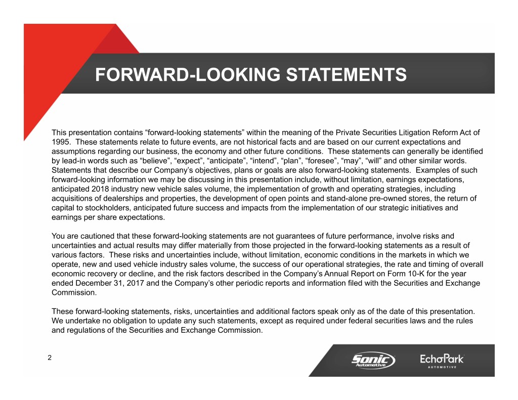 FORWARD-LOOKING STATEMENTS This presentation contains “forward-looking statements” within the meaning of the Private Securities Litigation Reform Act of 1995. These statements relate to future events, are not historical facts and are based on our current expectations and assumptions regarding our business, the economy and other future conditions. These statements can generally be identified by lead-in words such as “believe”, “expect”, “anticipate”, “intend”, “plan”, “foresee”, “may”, “will” and other similar words. Statements that describe our Company’s objectives, plans or goals are also forward-looking statements. Examples of such forward-looking information we may be discussing in this presentation include, without limitation, earnings expectations, anticipated 2018 industry new vehicle sales volume, the implementation of growth and operating strategies, including acquisitions of dealerships and properties, the development of open points and stand-alone pre-owned stores, the return of capital to stockholders, anticipated future success and impacts from the implementation of our strategic initiatives and earnings per share expectations. You are cautioned that these forward-looking statements are not guarantees of future performance, involve risks and uncertainties and actual results may differ materially from those projected in the forward-looking statements as a result of various factors. These risks and uncertainties include, without limitation, economic conditions in the markets in which we operate, new and used vehicle industry sales volume, the success of our operational strategies, the rate and timing of overall economic recovery or decline, and the risk factors described in the Company’s Annual Report on Form 10-K for the year ended December 31, 2017 and the Company’s other periodic reports and information filed with the Securities and Exchange Commission. These forward-looking statements, risks, uncertainties and additional factors speak only as of the date of this presentation. We undertake no obligation to update any such statements, except as required under federal securities laws and the rules and regulations of the Securities and Exchange Commission. 2