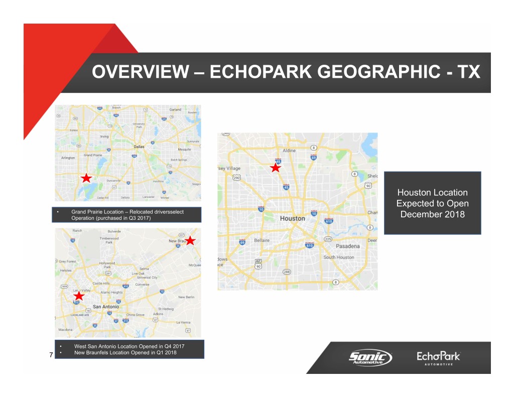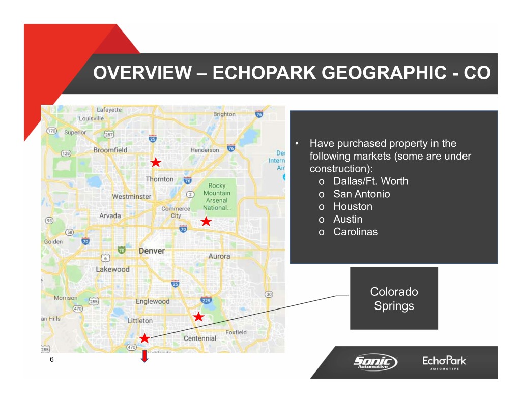 OVERVIEW – ECHOPARK GEOGRAPHIC - CO • Have purchased property in the following markets (some are under construction): o Dallas/Ft. Worth o San Antonio o Houston o Austin o Carolinas Colorado Springs 6