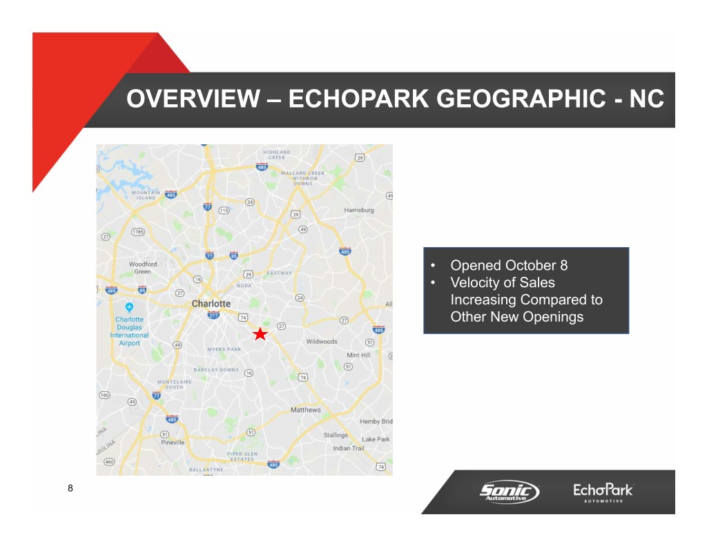 OVERVIEW – ECHOPARK GEOGRAPHIC - NC • Opened October 8 • Velocity of Sales Increasing Compared to Other New Openings 8