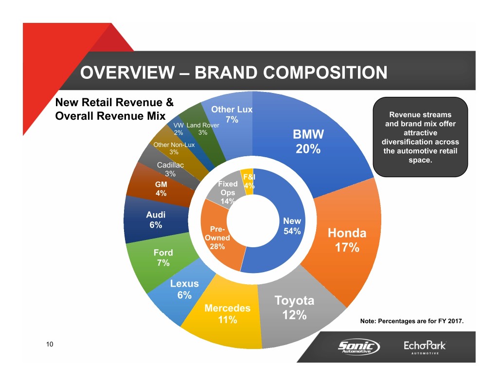 OVERVIEW - GEOGRAPHIC NV MD 2% 3% SC 2% OH VA 3% 3% NC 4% CA GA 3% 30% CO Concentration 7% in Major Metro AL Markets 5% FL 6% TN TX 7% 26% 9 Note: Percentages are percent of total revenue for FY 2017.
