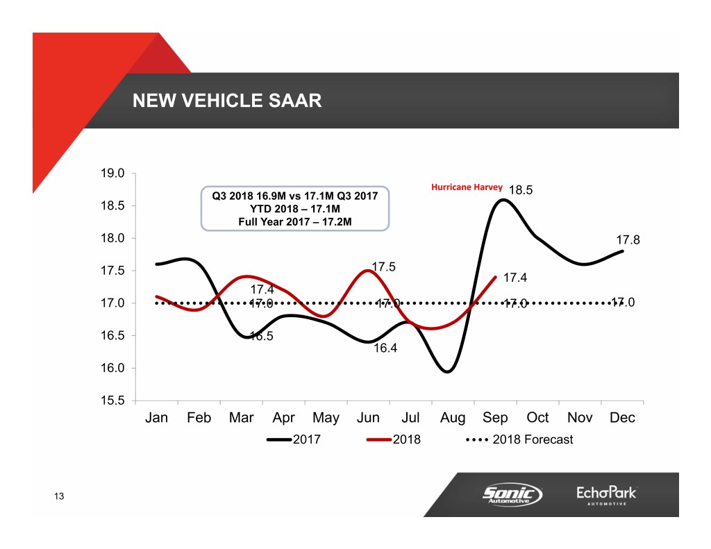 NEW VEHICLE SAAR 19.0 Hurricane Harvey Q3 2018 16.9M vs 17.1M Q3 2017 18.5 18.5 YTD 2018 – 17.1M Full Year 2017 – 17.2M 18.0 17.8 17.5 17.5 17.4 17.4 17.0 17.0 17.0 17.0 17.0 16.5 16.5 16.4 16.0 15.5 Jan Feb Mar Apr May Jun Jul Aug Sep Oct Nov Dec 2017 2018 2018 Forecast 13