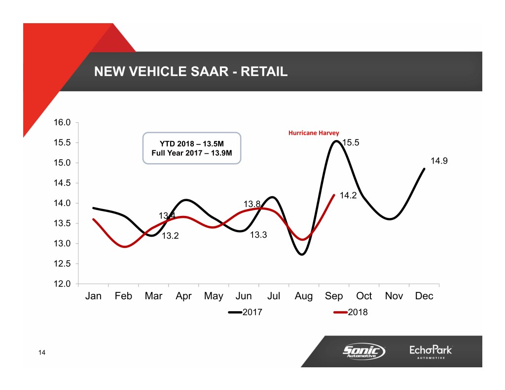 NEW VEHICLE SAAR - RETAIL 16.0 Hurricane Harvey 15.5 YTD 2018 – 13.5M 15.5 Full Year 2017 – 13.9M 15.0 14.9 14.5 14.2 14.0 13.8 13.4 13.5 13.2 13.3 13.0 12.5 12.0 Jan Feb Mar Apr May Jun Jul Aug Sep Oct Nov Dec 2017 2018 14