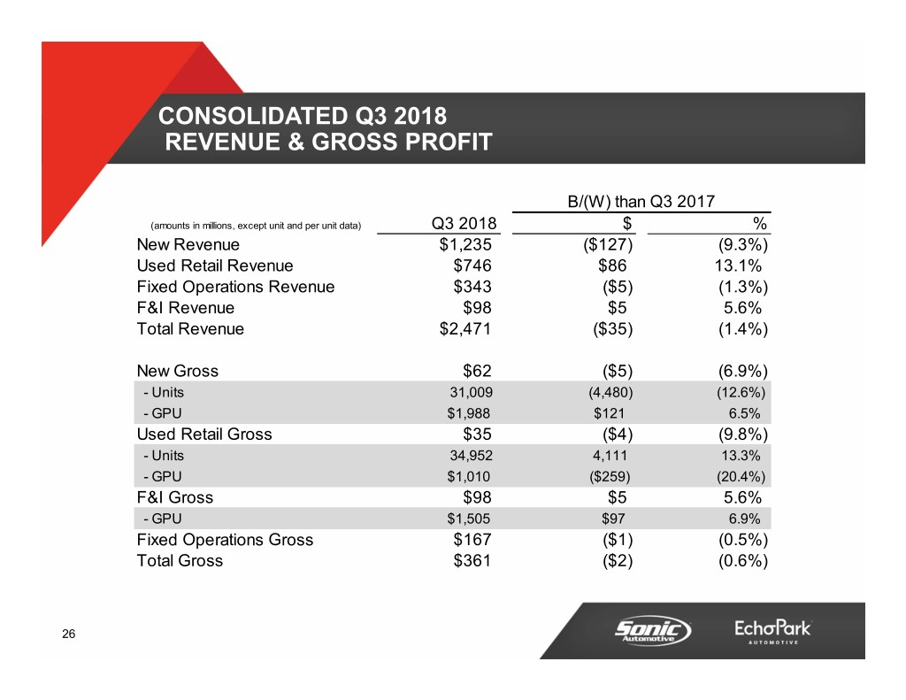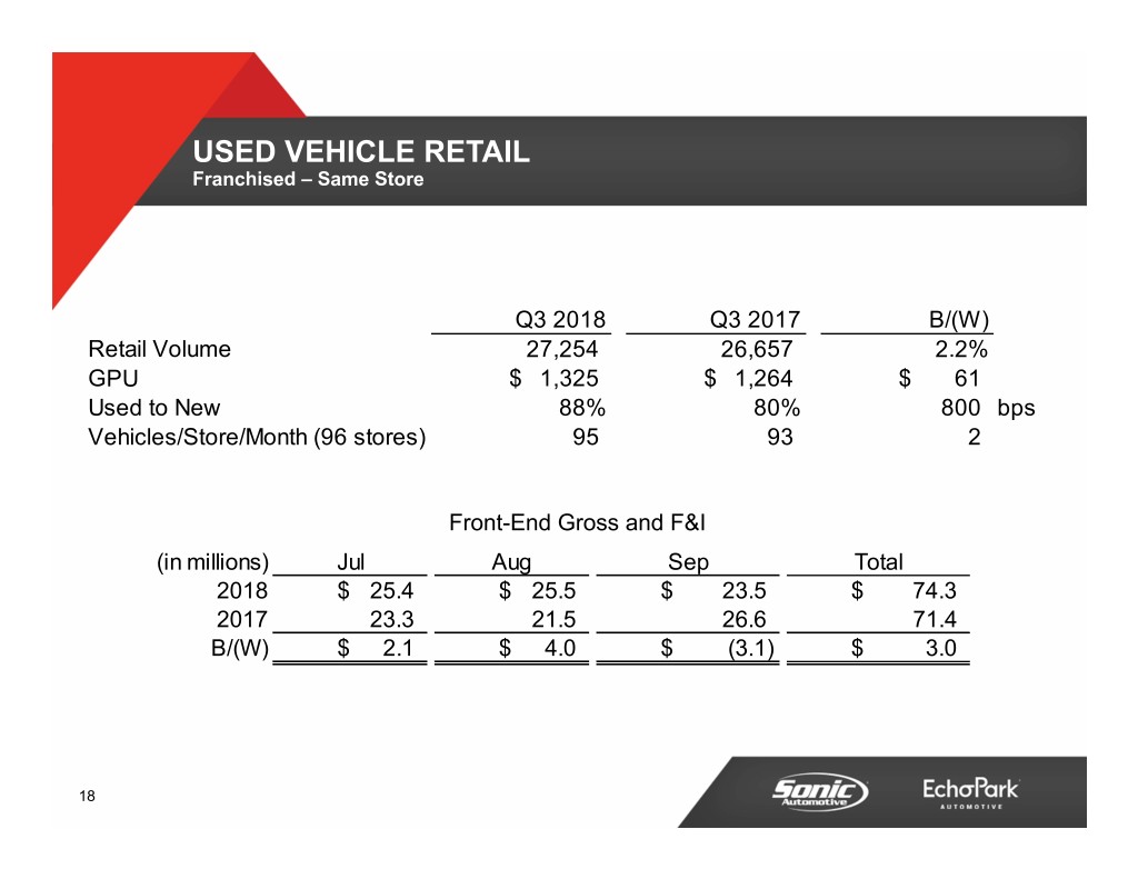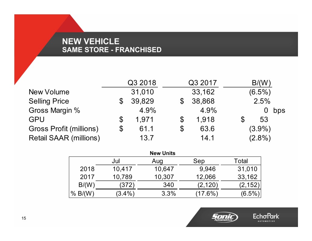 NEW VEHICLE SAME STORE - FRANCHISED Q3 2018 Q3 2017 B/(W) New Volume 31,010 33,162 (6.5%) Selling Price$ 39,829 $ 38,868 2.5% Gross Margin % 4.9% 4.9% 0 bps GPU$ 1,971 $ 1,918 $ 53 Gross Profit (millions)$ 61.1 $ 63.6 (3.9%) Retail SAAR (millions) 13.7 14.1 (2.8%) New Units Jul Aug Sep Total 2018 10,417 10,647 9,946 31,010 2017 10,789 10,307 12,066 33,162 B/(W) (372) 340 (2,120) (2,152) % B/(W) (3.4%) 3.3% (17.6%) (6.5%) 15