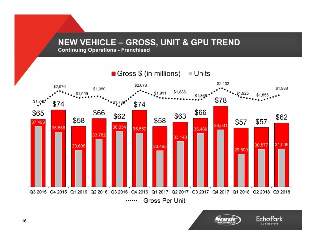 NEW VEHICLE – GROSS, UNIT & GPU TREND Continuing Operations - Franchised Gross $ (in millions) Units $2,132 $2,070 $2,078 $1,950 $1,988 $1,911 $1,886 $1,925 $1,909 $1,866 $1,855 $1,745 $78 $74 $1,730 $74 $65 $66 $66 $62 $63 $62 37,493 $58 $58 $57 36,531 $57 35,856 36,054 35,562 35,489 33,782 33,148 30,605 30,495 30,877 31,009 29,500 Q3 2015 Q4 2015 Q1 2016 Q2 2016 Q3 2016 Q4 2016 Q1 2017 Q2 2017 Q3 2017 Q4 2017 Q1 2018 Q2 2018 Q3 2018 Gross Per Unit 16