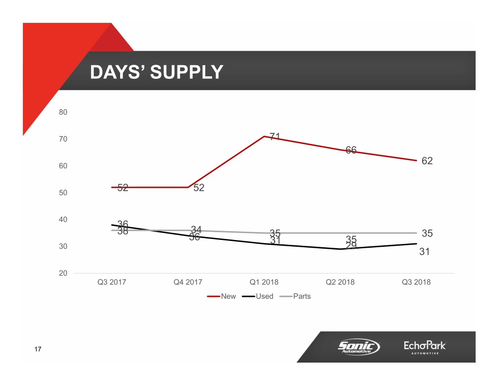 DAYS’ SUPPLY 80 70 71 66 60 62 50 52 52 40 36 38 34 35 35 36 31 35 30 29 31 20 Q3 2017 Q4 2017 Q1 2018 Q2 2018 Q3 2018 New Used Parts 17