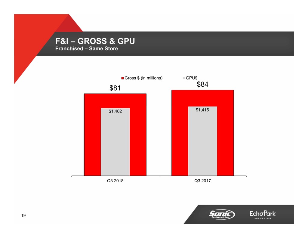 F&I – GROSS & GPU Franchised – Same Store Gross $ (in millions) GPU$ $84 $81 $1,402 $1,415 Q3 2018 Q3 2017 19
