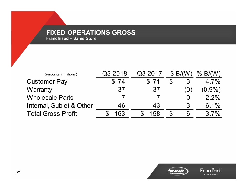 FIXED OPERATIONS Franchised – Same Store (amounts in millions) Q3 2018 Q3 2017 B/(W) Revenue$ 337 $ 327 2.8% Gross Profit$ 163 $ 158 3.7% 20