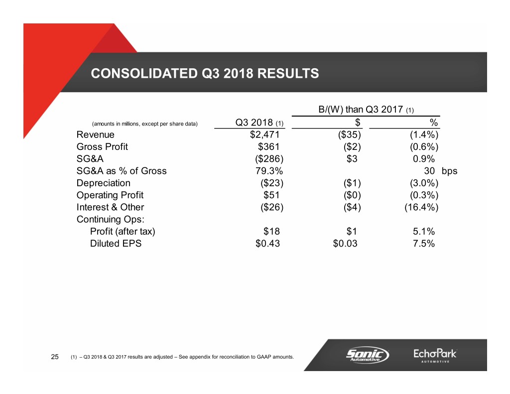 NON-GAAP RECONCILIATIONS Consolidated Franchised Dealerships EchoPark Three Months Ended Three Months Ended Three Months Ended September 30, September 30, September 30, Continuing Operations 2018 2017 2018 2017 2018 2017 (In millions) Reported: Operating income . . . . . . . . . . . . . . . . . . . . . . . . . . . . . . . . . . . . . . . . $ 48.1 $ 55.8 $ 52.5 $ 60.1 $ (4.4) $ (4.3) Adjustments (before income taxes): SG&A expenses . . . . . . . . . . . . . . . . . . . . . . . . . . . . . . . . . . . . . . . . . 3.1 (4.6) 3.1 (4.6) - - Impairment charges . . . . . . . . . . . . . . . . . . . . . . . . . . . . . . . . . . . . . - 0.2 - 0.2 - - Total adjustments before taxes . . . . . . . . . . . . . . . . . . . . . . . . . . 3.1 (4.4) 3.1 (4.4) - - Adjusted: Operating income . . . . . . . . . . . . . . . . . . . . . . . . . . . . . . . . . . . . . . . $ 51.2 $ 51.4 $ 55.6 $ 55.7 $ (4.4) $ (4.3) Reported: Income (loss) from continuing operations before taxes . . . . . $ 22.6$ 33.9 $ 28.1 $ 38.8 $ (5.5) $ (4.9) Adjustments (before income taxes): SG&A expenses . . . . . . . . . . . . . . . . . . . . . . . . . . . . . . . . . . . . . . . . . 3.1 (4.6) 3.1 (4.6) - - Impairment charges . . . . . . . . . . . . . . . . . . . . . . . . . . . . . . . . . . . . . - 0.2 - 0.2 - - Total adjustments before taxes . . . . . . . . . . . . . . . . . . . . . . . . . . 3.1 (4.4) 3.1 (4.4) - - Adjusted: Income (loss) from continuing operations before taxes . . . . . $ 25.7$ 29.5 $ 31.2 $ 34.4 $ (5.5) $ (4.9) Reported: Income (loss) from continuing operations . . . . . . . . . . . . . . . . . . $ 15.3 $ 19.7 Adjustments (net of income taxes): SG&A expenses . . . . . . . . . . . . . . . . . . . . . . . . . . . . . . . . . . . . . . . . . 2.2 (2.5) Impairment charges . . . . . . . . . . . . . . . . . . . . . . . . . . . . . . . . . . . . . - 0.2 Non-recurring tax items . . . . . . . . . . . . . . . . . . . . . . . . . . . . . . . . . . . 0.8 - Total adjustments, net of income taxes . . . . . . . . . . . . . . . . . . . 3.0 (2.3) Adjusted: Income (loss) from continuing operations . . . . . . . . . . . . . . . . . . $ 18.3 $ 17.4 39