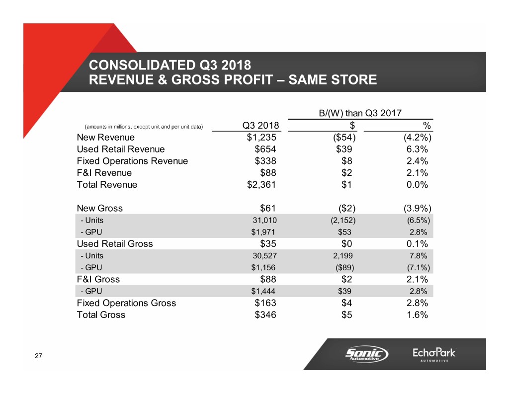 CONSOLIDATED Q3 2018 REVENUE & GROSS PROFIT B/(W) than Q3 2017 (amounts in millions, except unit and per unit data) Q3 2018 $ % New Revenue $1,235 ($127) (9.3%) Used Retail Revenue $746 $86 13.1% Fixed Operations Revenue $343 ($5) (1.3%) F&I Revenue $98 $5 5.6% Total Revenue $2,471 ($35) (1.4%) New Gross $62 ($5) (6.9%) - Units 31,009 (4,480) (12.6%) - GPU $1,988 $121 6.5% Used Retail Gross $35 ($4) (9.8%) - Units 34,952 4,111 13.3% - GPU $1,010 ($259) (20.4%) F&I Gross $98 $5 5.6% - GPU $1,505 $97 6.9% Fixed Operations Gross $167 ($1) (0.5%) Total Gross $361 ($2) (0.6%) 26