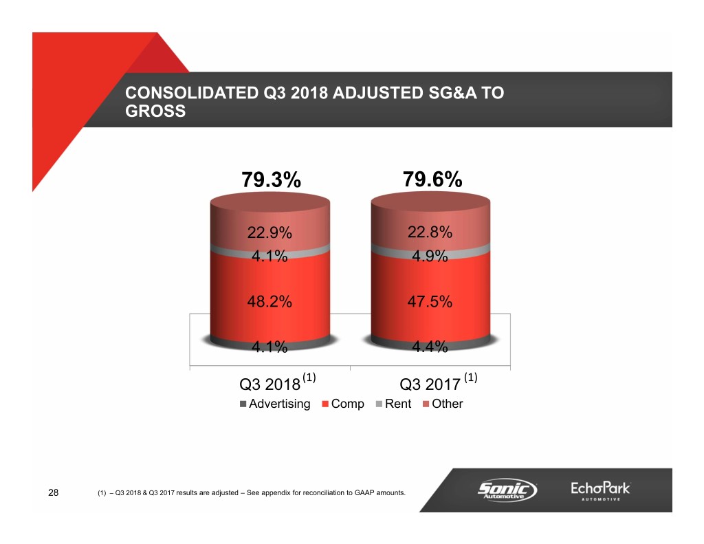 NON-GAAP RECONCILIATIONS Consolidated Franchised Dealerships EchoPark Nine Months Ended Nine Months Ended Nine Months Ended September 30, September 30, September 30, Continuing Operations 2018 2017 2018 2017 2018 2017 (In millions) Reported: SG&A expenses . . . . . . . . . . . . . . . . . . . . . . . . . . . . . . . . . . . . . . . . . $ 871.4 $ 870.1 $ 791.1 $ 842.8 $ 80.3 $ 27.3 Adjustments: Legal and storm damage charges . . . . . . . . . . . . . . . . . . . . . . . . . (5.7) (10.7) (5.7) (10.7) - - Long-term compensation-related charges . . . . . . . . . . . . . . . . . . (32.6) - - - (32.6) - Executive transition costs . . . . . . . . . . . . . . . . . . . . . . . . . . . . . . . . (1.6) - (1.6) - - - Lease exit adjustments . . . . . . . . . . . . . . . . . . . . . . . . . . . . . . . . . . . (2.2) (1.0) (2.2) (0.4) - (0.6) Gain (loss) on disposal of franchises . . . . . . . . . . . . . . . . . . . . . . 38.9 8.5 38.9 8.5 - - Total SG&A adjustments . . . . . . . . . . . . . . . . . . . . . . . . . . . . . . . . (3.2) (3.2) 29.4 (2.6) (32.6) (0.6) Adjusted: SG&A expenses . . . . . . . . . . . . . . . . . . . . . . . . . . . . . . . . . . . . . . . . . $ 868.2 $ 866.9 $ 820.5 $ 840.2 $ 47.7 $ 26.7 Reported: SG&A expenses as % of gross profit . . . . . . . . . . . . . . . . . . . . . . . 81.0% 81.0% 76.5% 79.7% NM NM Adjustments: Legal and storm damage charges . . . . . . . . . . . . . . . . . . . . . . . . . (0.5%) (1.0%) (0.5%) (1.0%) - - Long-term compensation-related charges . . . . . . . . . . . . . . . . . . (3.1%) - - - (3.1%) - Executive transition costs . . . . . . . . . . . . . . . . . . . . . . . . . . . . . . . . (0.1%) - (0.1%) - - - Lease exit adjustments . . . . . . . . . . . . . . . . . . . . . . . . . . . . . . . . . . . (0.2%) (0.1%) (0.2%) (0.1%) - - Gain (loss) on disposal of franchises . . . . . . . . . . . . . . . . . . . . . . 3.7% 0.8% 3.7% 0.8% - - Total SG&A adjustments . . . . . . . . . . . . . . . . . . . . . . . . . . . . . . . . (0.3%) (0.3%) 2.8% (0.3%) (3.1%) - Adjusted: SG&A expenses as % of gross profit . . . . . . . . . . . . . . . . . . . . . . . 80.7% 80.7% 79.3% 79.4% NM NM NM = Not meaningful 40