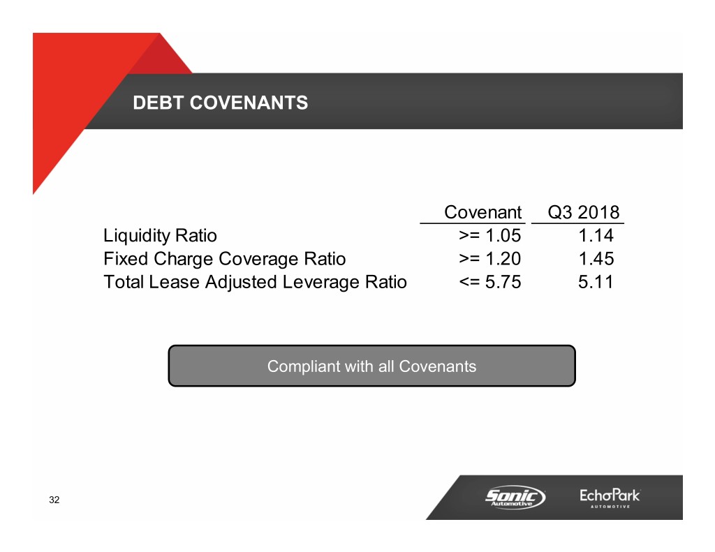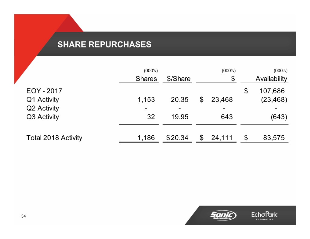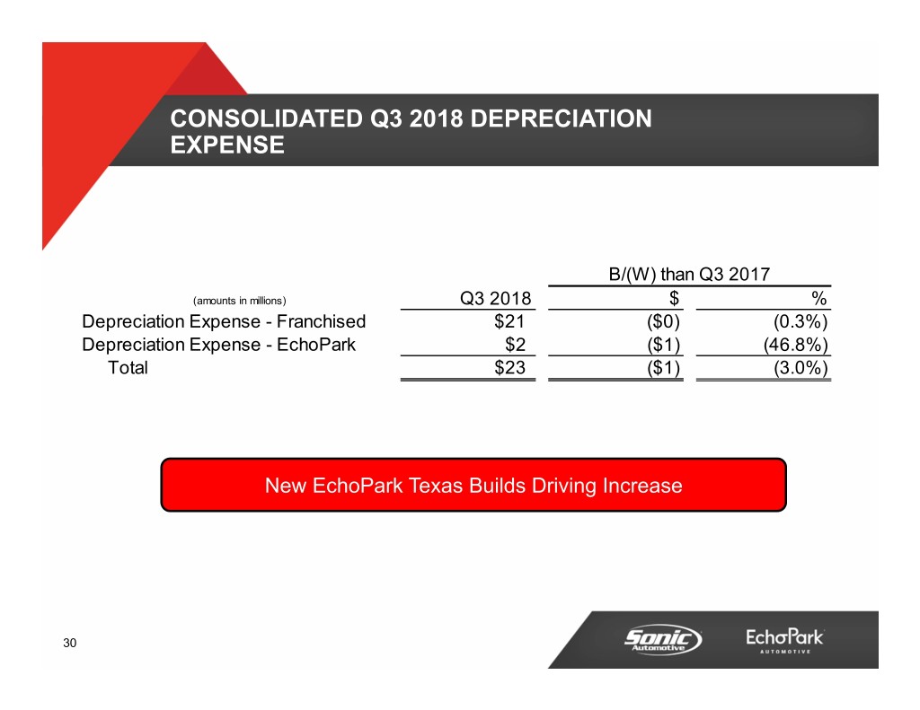 CONSOLIDATED Q3 2018 DEPRECIATION EXPENSE B/(W) than Q3 2017 (amounts in millions) Q3 2018 $ % Depreciation Expense - Franchised $21 ($0) (0.3%) Depreciation Expense - EchoPark $2 ($1) (46.8%) Total $23 ($1) (3.0%) New EchoPark Texas Builds Driving Increase 30