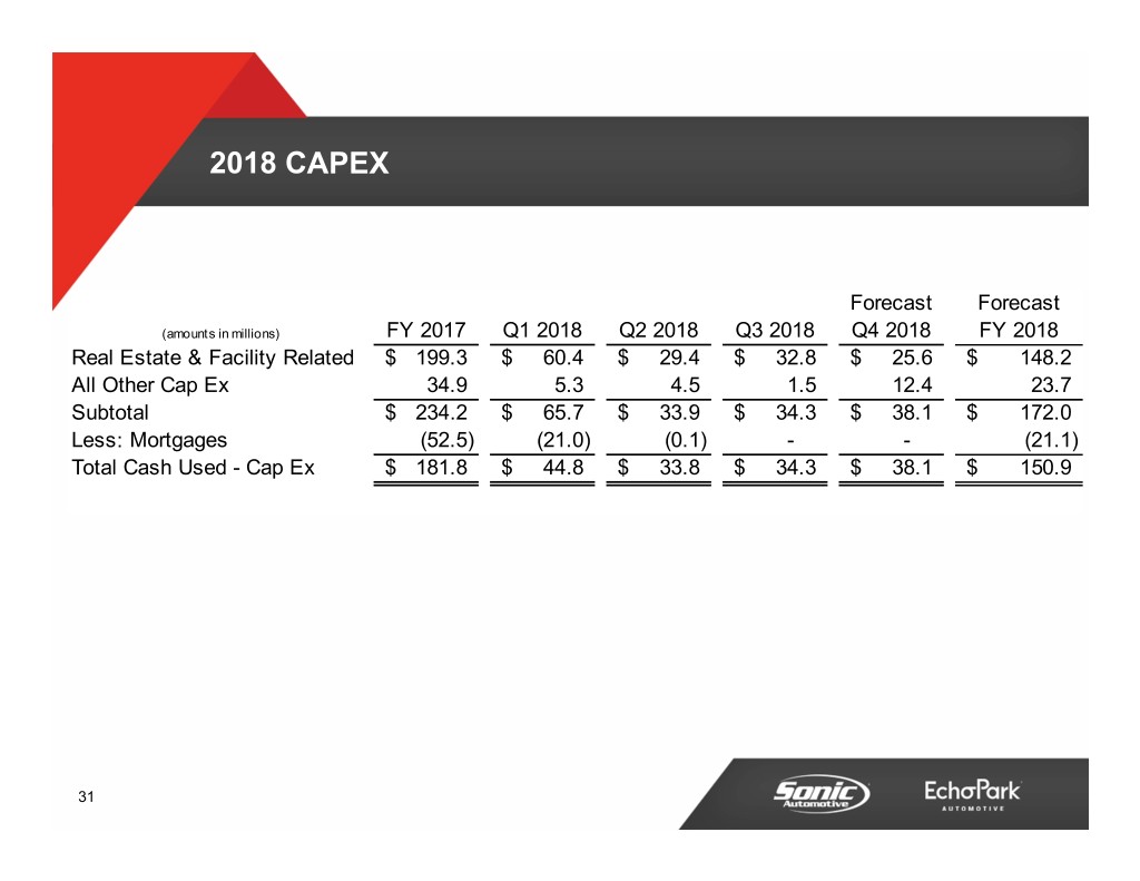 2018 CAPEX Forecast Forecast (amounts in millions) FY 2017 Q1 2018 Q2 2018 Q3 2018 Q4 2018 FY 2018 Real Estate & Facility Related $ 199.3 $ 60.4 $ 29.4 $ 32.8 $ 25.6 $ 148.2 All Other Cap Ex 34.9 5.3 4.5 1.5 12.4 23.7 Subtotal$ 234.2 $ 65.7 $ 33.9 $ 34.3 $ 38.1 $ 172.0 Less: Mortgages (52.5) (21.0) (0.1) - - (21.1) Total Cash Used - Cap Ex$ 181.8 $ 44.8 $ 33.8 $ 34.3 $ 38.1 $ 150.9 31