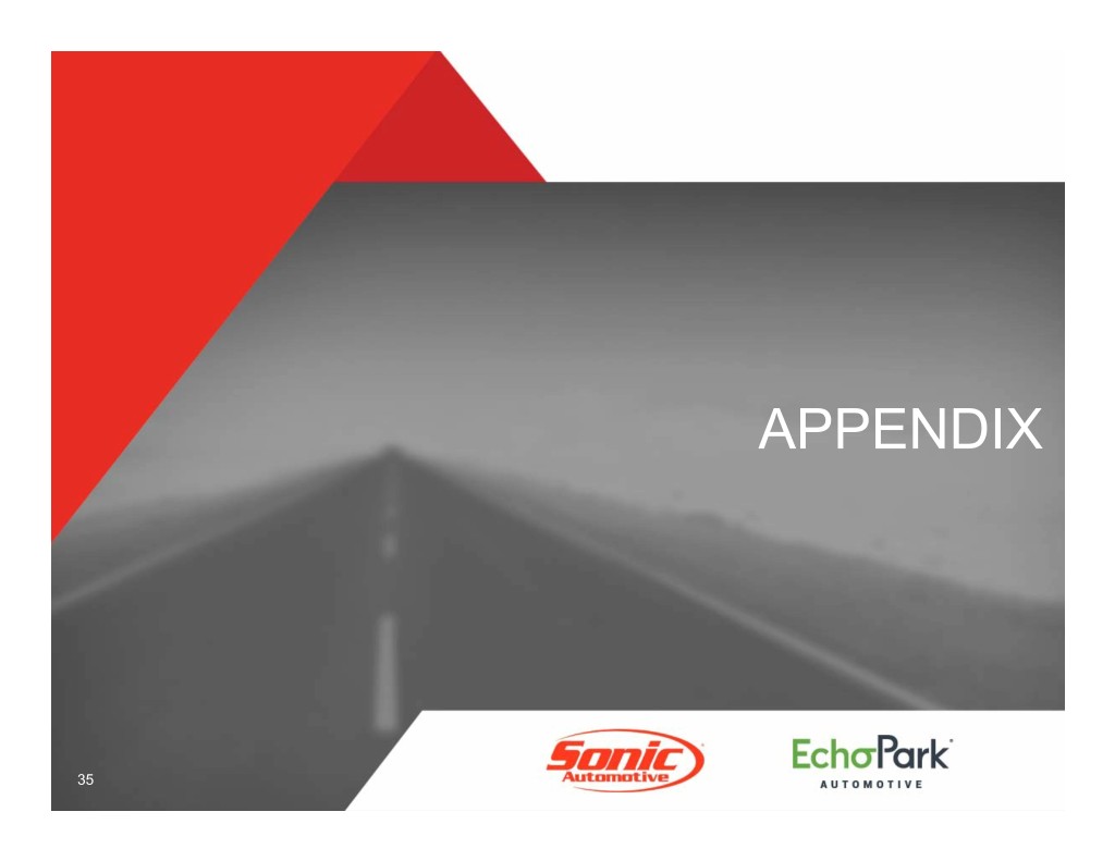 ADJUSTED EBITDA LTM Q3 (amounts in thousands) 2009 2010 2011 2012 2013 2014 2015 2016 2017 2018 Net Income $ 31,548 $ 89,929 $ 76,254 $ 89,101 $ 81,618 $ 97,217 $ 86,311 $ 93,193 $ 92,983 $ 91,782 Non-Floor Plan Interest 67,735 68,604 63,576 58,453 55,356 52,269 49,524 48,034 50,531 51,483 Depreciation & Amortization 57,036 45,827 51,164 52,616 58,139 62,161 72,130 81,034 92,127 97,309 Income Taxes (53,900) (19,745) 46,907 47,648 43,386 62,346 55,962 59,899 13,198 5,093 Stock Compensation 1,931 2,814 3,698 5,160 7,208 7,675 9,814 11,165 11,119 12,806 Lease Exit Charges 33,013 4,266 4,384 4,286 2,915 302 1,848 1,386 2,157 2,258 Impairment 30,038 249 1,151 950 9,872 6,594 17,955 8,063 9,394 20,039 Loss (Gain) on Debt Extinguishment 6,745 7,665 1,107 19,713 28,238 - - (6) 14,607 - Long-Term Compensation Arrangements - - - - - - - - - 33,795 Loss (Gain) on Dealership Disposal 102 (2,615) 386 (10,343) 457 (11,279) (2,748) 48 (9,980) (40,662) Adjusted EBITDA $ 174,248 $ 196,994 $ 248,627 $ 267,584 $ 287,189 $ 277,285 $ 290,796 $ 302,816 $ 276,136 $ 273,903 33