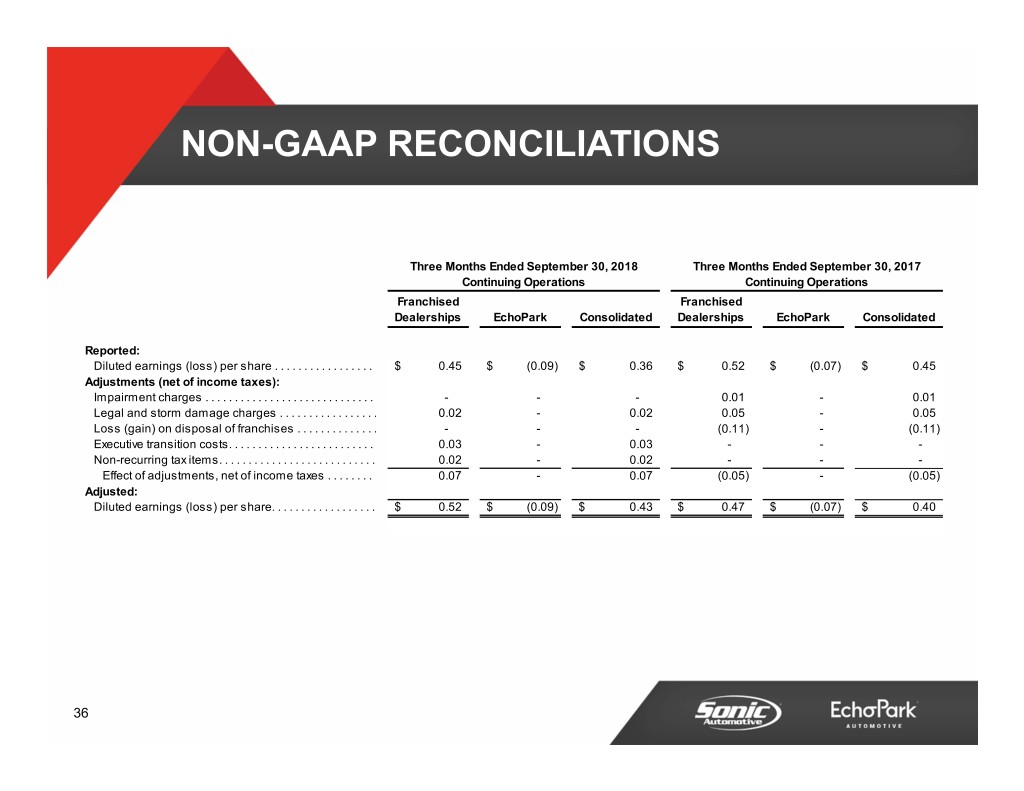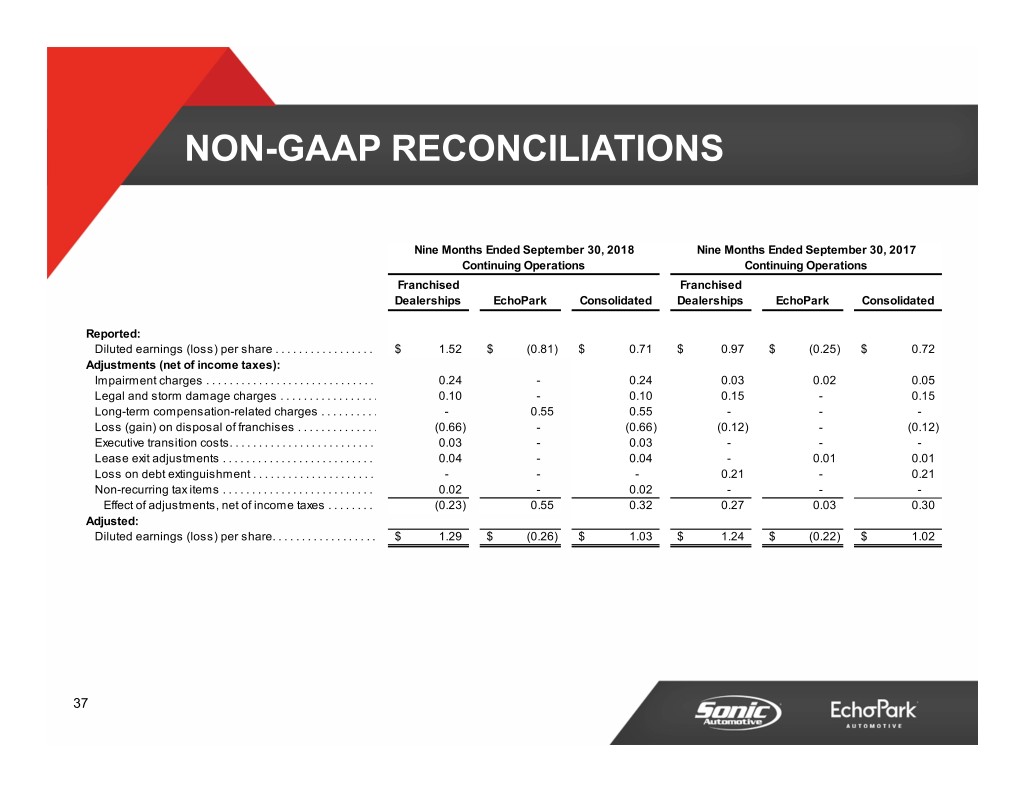 NON-GAAP RECONCILIATIONS Three Months Ended September 30, 2018 Three Months Ended September 30, 2017 Continuing Operations Continuing Operations Franchised Franchised Dealerships EchoPark Consolidated Dealerships EchoPark Consolidated Reported: Diluted earnings (loss) per share . . . . . . . . . . . . . . . . . $ 0.45 $ (0.09) $ 0.36 $ 0.52 $ (0.07) $ 0.45 Adjustments (net of income taxes): Impairment charges . . . . . . . . . . . . . . . . . . . . . . . . . . . . . - - - 0.01 - 0.01 Legal and storm damage charges . . . . . . . . . . . . . . . . . 0.02 - 0.02 0.05 - 0.05 Loss (gain) on disposal of franchises . . . . . . . . . . . . . . - - - (0.11) - (0.11) Executive transition costs. . . . . . . . . . . . . . . . . . . . . . . . . 0.03 - 0.03 - - - Non-recurring tax items. . . . . . . . . . . . . . . . . . . . . . . . . . . 0.02 - 0.02 - - - Effect of adjustments, net of income taxes . . . . . . . . 0.07 - 0.07 (0.05) - (0.05) Adjusted: Diluted earnings (loss) per share. . . . . . . . . . . . . . . . . . $ 0.52 $ (0.09) $ 0.43 $ 0.47 $ (0.07) $ 0.40 36