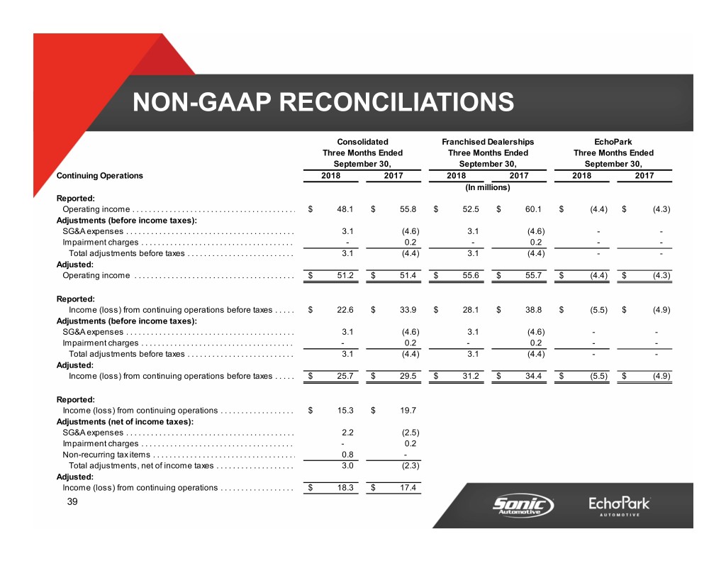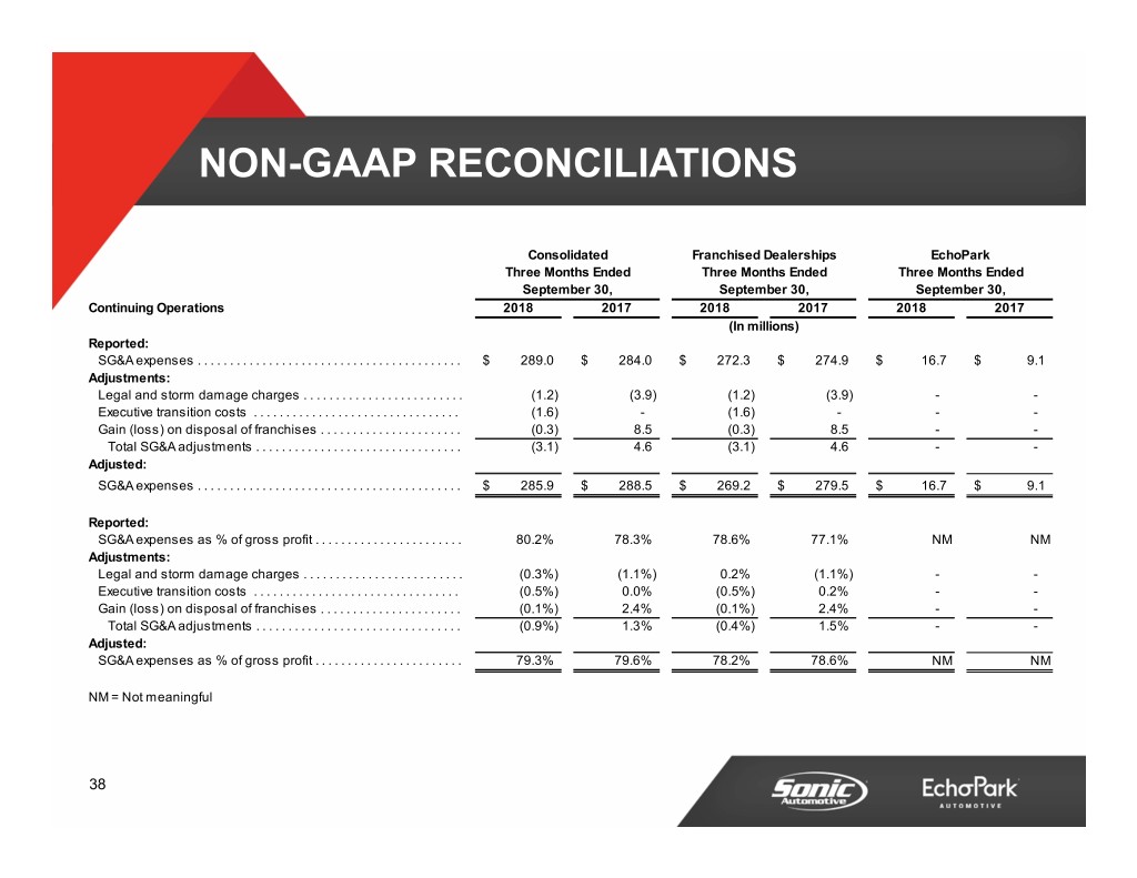 NON-GAAP RECONCILIATIONS Consolidated Franchised Dealerships EchoPark Three Months Ended Three Months Ended Three Months Ended September 30, September 30, September 30, Continuing Operations 2018 2017 2018 2017 2018 2017 (In millions) Reported: SG&A expenses . . . . . . . . . . . . . . . . . . . . . . . . . . . . . . . . . . . . . . . . . $ 289.0 $ 284.0 $ 272.3 $ 274.9 $ 16.7 $ 9.1 Adjustments: Legal and storm damage charges . . . . . . . . . . . . . . . . . . . . . . . . . (1.2) (3.9) (1.2) (3.9) - - Executive transition costs . . . . . . . . . . . . . . . . . . . . . . . . . . . . . . . . (1.6) - (1.6) - - - Gain (loss) on disposal of franchises . . . . . . . . . . . . . . . . . . . . . . (0.3) 8.5 (0.3) 8.5 - - Total SG&A adjustments . . . . . . . . . . . . . . . . . . . . . . . . . . . . . . . . (3.1) 4.6 (3.1) 4.6 - - Adjusted: SG&A expenses . . . . . . . . . . . . . . . . . . . . . . . . . . . . . . . . . . . . . . . . . $ 285.9 $ 288.5 $ 269.2 $ 279.5 $ 16.7 $ 9.1 Reported: SG&A expenses as % of gross profit . . . . . . . . . . . . . . . . . . . . . . . 80.2% 78.3% 78.6% 77.1% NM NM Adjustments: Legal and storm damage charges . . . . . . . . . . . . . . . . . . . . . . . . . (0.3%) (1.1%) 0.2% (1.1%) - - Executive transition costs . . . . . . . . . . . . . . . . . . . . . . . . . . . . . . . . (0.5%) 0.0% (0.5%) 0.2% - - Gain (loss) on disposal of franchises . . . . . . . . . . . . . . . . . . . . . . (0.1%) 2.4% (0.1%) 2.4% - - Total SG&A adjustments . . . . . . . . . . . . . . . . . . . . . . . . . . . . . . . . (0.9%) 1.3% (0.4%) 1.5% - - Adjusted: SG&A expenses as % of gross profit . . . . . . . . . . . . . . . . . . . . . . . 79.3% 79.6% 78.2% 78.6% NM NM NM = Not meaningful 38