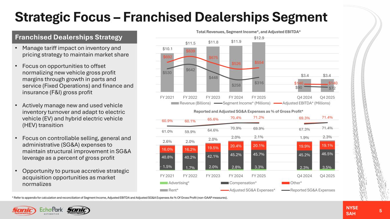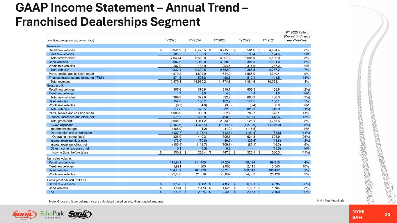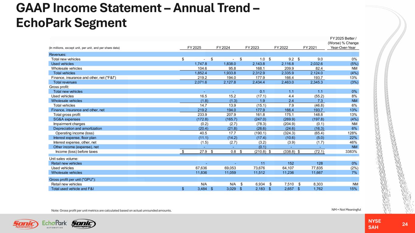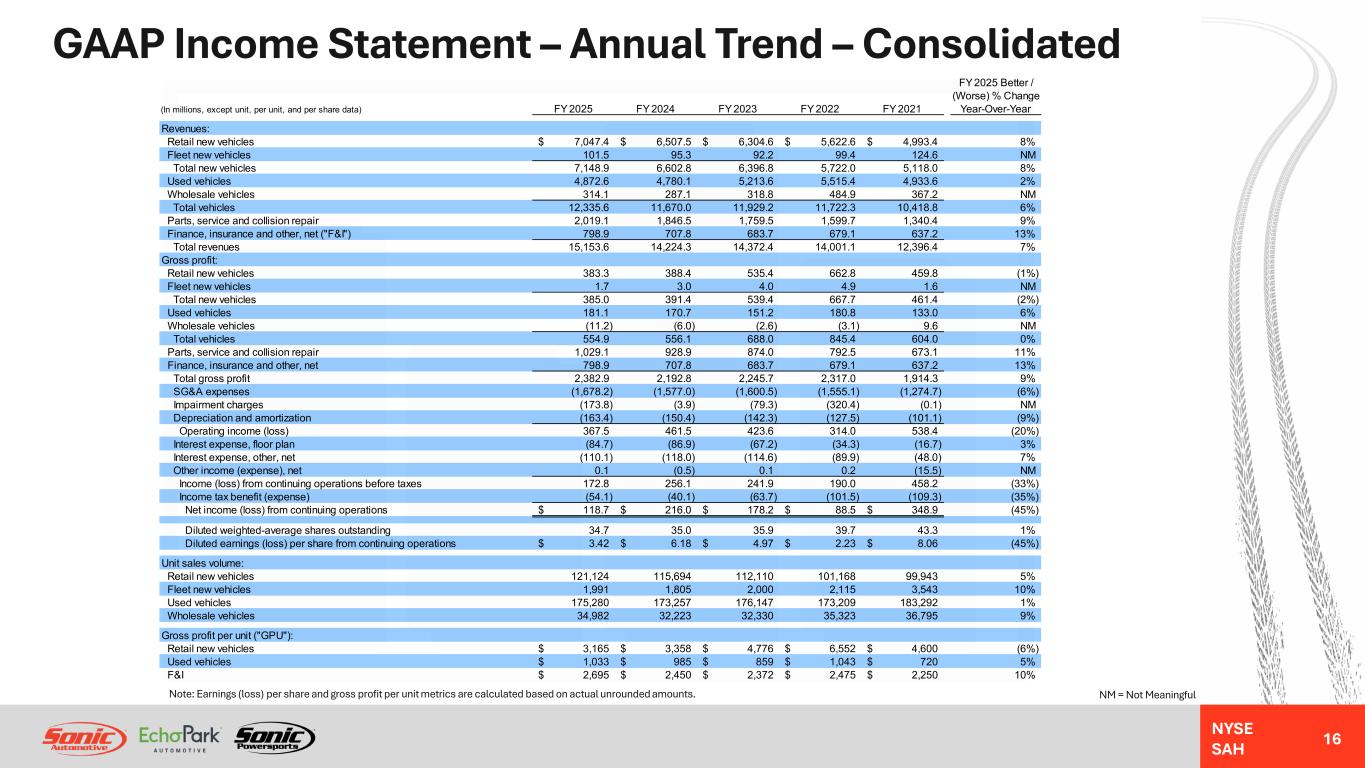 NYSE SAH GAAP Income Statement – Annual Trend – EchoPark Segment 24 NM = Not MeaningfulNote: Gross profit per unit metrics are calculated based on actual unrounded amounts. FY 2025 Better / (Worse) % Change (In millions, except unit, per unit, and per share data) FY 2025 FY 2024 FY 2023 FY 2022 FY 2021 Year-Over-Year Revenues: Total new vehicles -$ -$ 1.0$ 9.2$ 9.0$ 0% Used vehicles 1,747.8 1,838.0 2,143.8 2,116.8 2,032.6 (5%) Wholesale vehicles 104.6 95.8 168.1 209.9 82.4 NM Total vehicles 1,852.4 1,933.8 2,312.9 2,335.9 2,124.0 (4%) Finance, insurance and other, net ("F&I") 219.2 194.0 177.9 166.4 193.7 13% Total revenues 2,071.6 2,127.8 2,434.4 2,463.0 2,345.3 (3%) Gross profit: Total new vehicles - - 0.1 1.1 1.1 0% Used vehicles 16.5 15.2 (17.1) 4.4 (55.2) 8% Wholesale vehicles (1.8) (1.3) 1.9 2.4 7.3 NM Total vehicles 14.7 13.9 (15.1) 7.9 (46.8) 6% Finance, insurance and other, net 219.2 194.0 177.9 166.4 193.7 13% Total gross profit 233.9 207.9 161.8 175.1 148.8 13% SG&A expenses (172.8) (165.7) (247.0) (269.9) (197.8) (4%) Impairment charges (0.2) (2.7) (78.3) (204.9) (0.1) NM Depreciation and amortization (20.4) (21.8) (26.6) (24.6) (16.3) 6% Operating income (loss) 40.5 17.7 (190.1) (324.3) (65.4) 128% Interest expense, floor plan (11.1) (14.2) (17.4) (10.6) (5.0) 22% Interest expense, other, net (1.5) (2.7) (3.2) (3.9) (1.7) 46% Other income (expense), net - - (0.1) - - NM Income (loss) before taxes 27.9$ 0.8$ (210.8)$ (338.8)$ (72.1)$ 3383% Unit sales volume: Retail new vehicles - - 11 152 128 0% Used vehicles 67,636 69,053 73,676 64,107 77,835 (2%) Wholesale vehicles 11,836 11,059 11,512 11,236 11,667 7% Gross profit per unit ("GPU"): Retail new vehicles N/A N/A 6,934$ 7,510$ 8,303$ NM Total used vehicle and F&I 3,484$ 3,029$ 2,183$ 2,657$ 1,762$ 15%