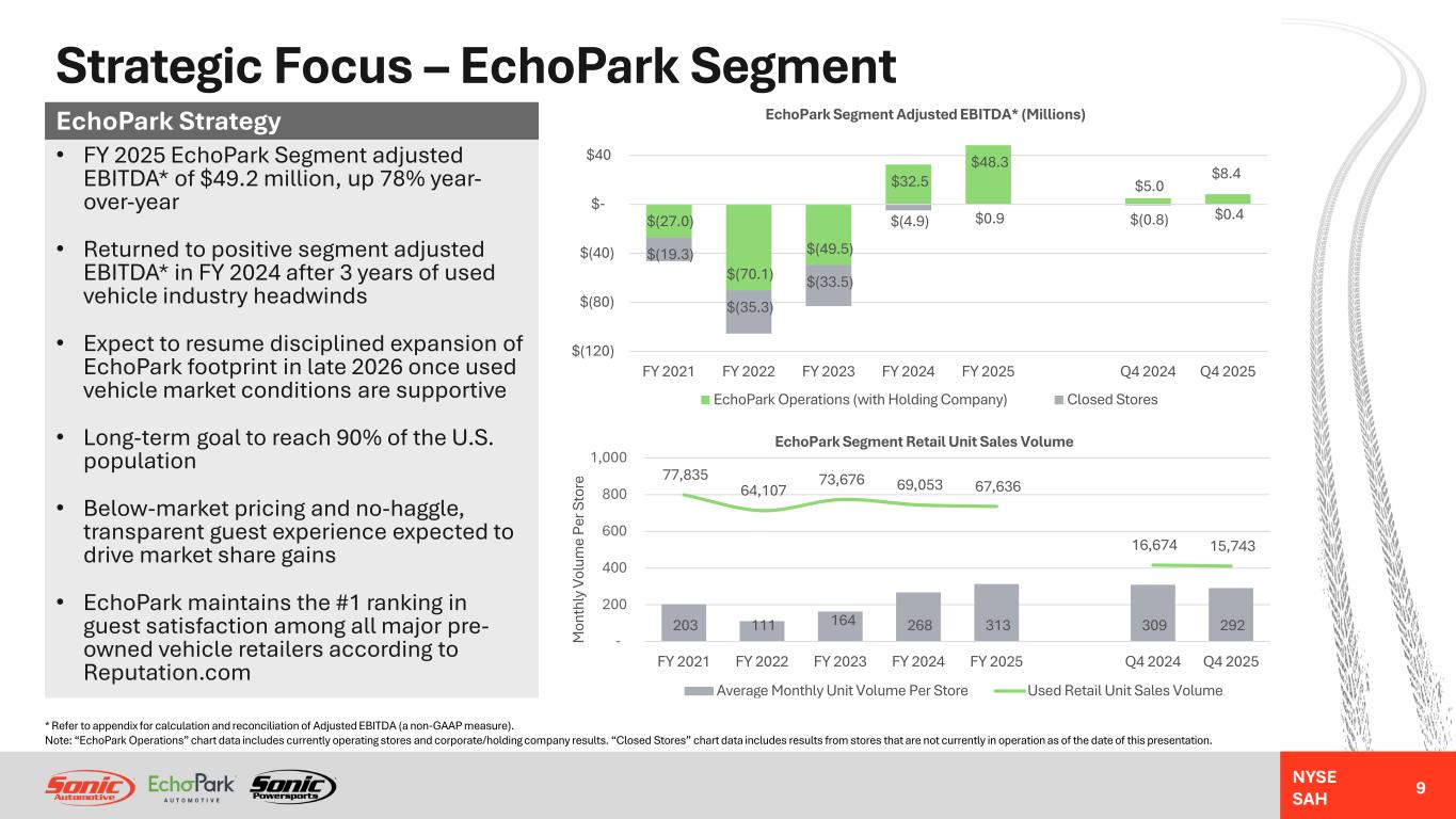 NYSE SAH Strategic Focus – EchoPark Segment • FY 2025 EchoPark Segment adjusted EBITDA* of $49.2 million, up 78% year- over-year • Returned to positive segment adjusted EBITDA* in FY 2024 after 3 years of used vehicle industry headwinds • Expect to resume disciplined expansion of EchoPark footprint in late 2026 once used vehicle market conditions are supportive • Long-term goal to reach 90% of the U.S. population • Below-market pricing and no-haggle, transparent guest experience expected to drive market share gains • EchoPark maintains the #1 ranking in guest satisfaction among all major pre- owned vehicle retailers according to Reputation.com EchoPark Strategy * Refer to appendix for calculation and reconciliation of Adjusted EBITDA (a non-GAAP measure). Note: “EchoPark Operations” chart data includes currently operating stores and corporate/holding company results. “Closed Stores” chart data includes results from stores that are not currently in operation as of the date of this presentation. $(27.0) $(70.1) $(49.5) $32.5 $48.3 $5.0 $8.4 $(19.3) $(35.3) $(33.5) $(4.9) $0.9 $(0.8) $0.4 $(120) $(80) $(40) $- $40 FY 2021 FY 2022 FY 2023 FY 2024 FY 2025 Q4 2024 Q4 2025 EchoPark Segment Adjusted EBITDA* (Millions) EchoPark Operations (with Holding Company) Closed Stores 203 111 164 268 313 309 292 77,835 64,107 73,676 69,053 67,636 16,674 15,743 - 200 400 600 800 1,000 FY 2021 FY 2022 FY 2023 FY 2024 FY 2025 Q4 2024 Q4 2025 M on th ly V ol um e Pe r S to re EchoPark Segment Retail Unit Sales Volume Average Monthly Unit Volume Per Store Used Retail Unit Sales Volume 9