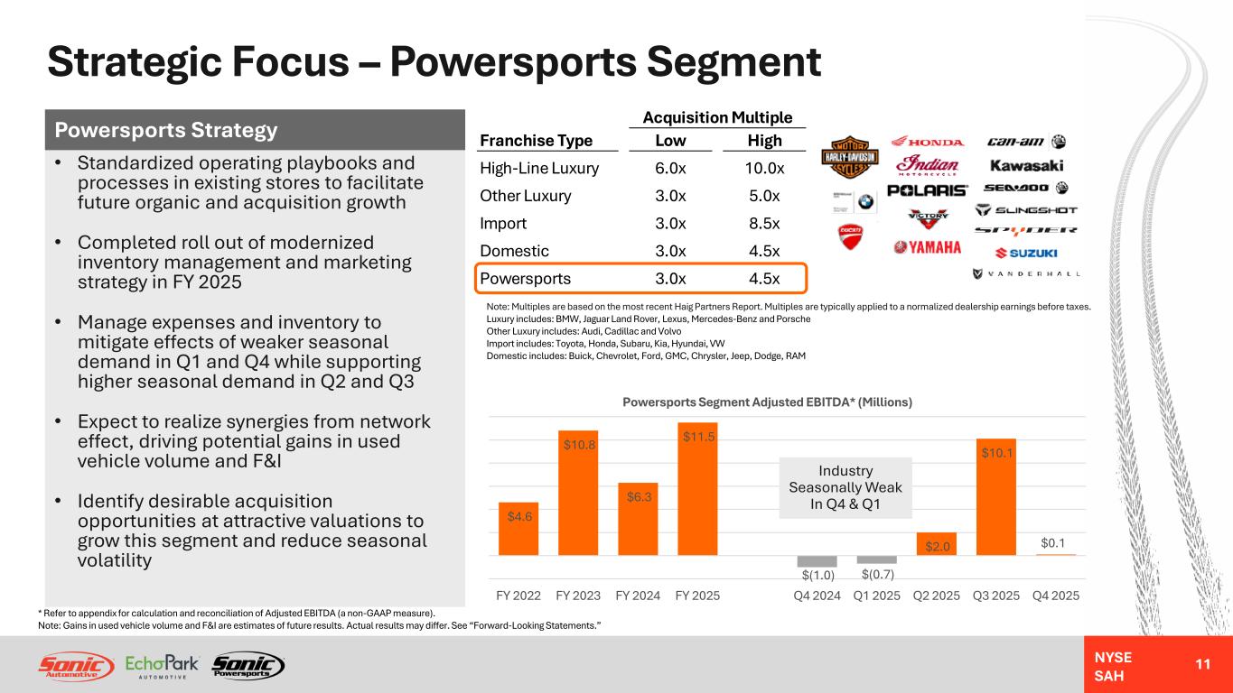 NYSE SAH Strategic Focus – EchoPark Segment (continued) 10 • Maintain focus on optimizing F&I product offerings, cost, and pricing to drive F&I GPU growth in FY 2026 • Focus on maintaining positive retail used vehicle GPU throughout FY 2026 driven by fast inventory turns, expected stability in the spread between wholesale and retail prices, and a focus on sourcing more inventory from non-auction sources, which should drive total GPU in the $3,400 to $3,600 range • Anticipate additional demand in the used vehicle market as a result of tariff effects on new vehicle pricing, which may put further pressure on used vehicle affordability • Used vehicle supply reached its lowest point in late 2025, due to lower levels of off-lease inventory as a result of declines in new vehicle industry sales volume and fewer lease originations since 2020 (see chart for supply trend of 3-year-old vehicles, which approximates the average age of vehicles in our inventory mix) • Beginning in 2026, gradual expansion of used vehicle supply and further normalization of used vehicle pricing should drive consumer demand and higher retail sales volume for EchoPark EchoPark Strategy $(47.8) $(105.4) $(83.0) $27.6 $49.2 $4.2 $8.8 $1,762 $2,657 $2,183 $3,029 $3,484 $2,974 $3,420 FY 2021 FY 2022 FY 2023 FY 2024 FY 2025 Q4 2024 Q4 2025 EchoPark Segment Adjusted EBITDA* and Total GPU (Used GPU + F&I GPU) Adjusted EBITDA* (Millions) Total GPU Source: J.D. Power Vehicle Age (0-5 Years) * Refer to appendix for calculation and reconciliation of Adjusted EBITDA (a non-GAAP measure). Note: F&I GPU growth, total GPU, used vehicle price and supply, and sales volume projections are estimates of future results. Actual results may differ. See “Forward-Looking Statements.” 4.8 5.1 5.1 5.1 4.7 4.1 3.4 3.7 3.8 4.6 0 3 6 9 12 15 18 2019 2020 2021 2022 2023 2024 2025 2026E 2027E 2028E (In M ill io ns ) Used Vehicle Supply Trend For Units Up To Five Years In Age 0 1 2 3 4 5 Forecast