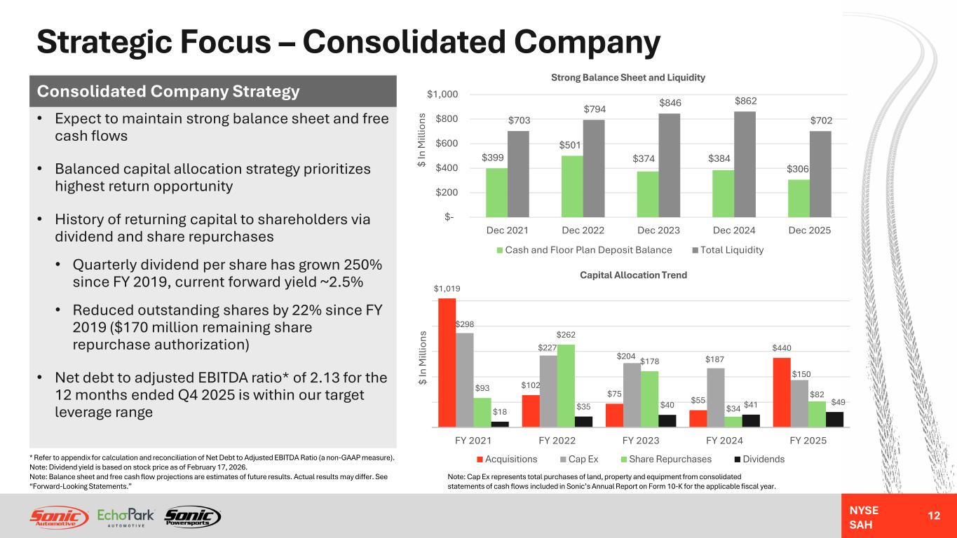 NYSE SAH Strategic Focus – Consolidated Company 12 • Expect to maintain strong balance sheet and free cash flows • Balanced capital allocation strategy prioritizes highest return opportunity • History of returning capital to shareholders via dividend and share repurchases • Quarterly dividend per share has grown 250% since FY 2019, current forward yield ~2.5% • Reduced outstanding shares by 22% since FY 2019 ($170 million remaining share repurchase authorization) • Net debt to adjusted EBITDA ratio* of 2.13 for the 12 months ended Q4 2025 is within our target leverage range Consolidated Company Strategy $399 $501 $374 $384 $306 $703 $794 $846 $862 $702 $- $200 $400 $600 $800 $1,000 Dec 2021 Dec 2022 Dec 2023 Dec 2024 Dec 2025 $ In M ill io ns Strong Balance Sheet and Liquidity Cash and Floor Plan Deposit Balance Total Liquidity * Refer to appendix for calculation and reconciliation of Net Debt to Adjusted EBITDA Ratio (a non-GAAP measure). Note: Dividend yield is based on stock price as of February 17, 2026. Note: Balance sheet and free cash flow projections are estimates of future results. Actual results may differ. See “Forward-Looking Statements.” $1,019 $102 $75 $55 $440 $298 $227 $204 $187 $150 $93 $262 $178 $34 $82 $18 $35 $40 $41 $49 FY 2021 FY 2022 FY 2023 FY 2024 FY 2025 $ In M ill io ns Capital Allocation Trend Acquisitions Cap Ex Share Repurchases Dividends Note: Cap Ex represents total purchases of land, property and equipment from consolidated statements of cash flows included in Sonic’s Annual Report on Form 10-K for the applicable fiscal year.