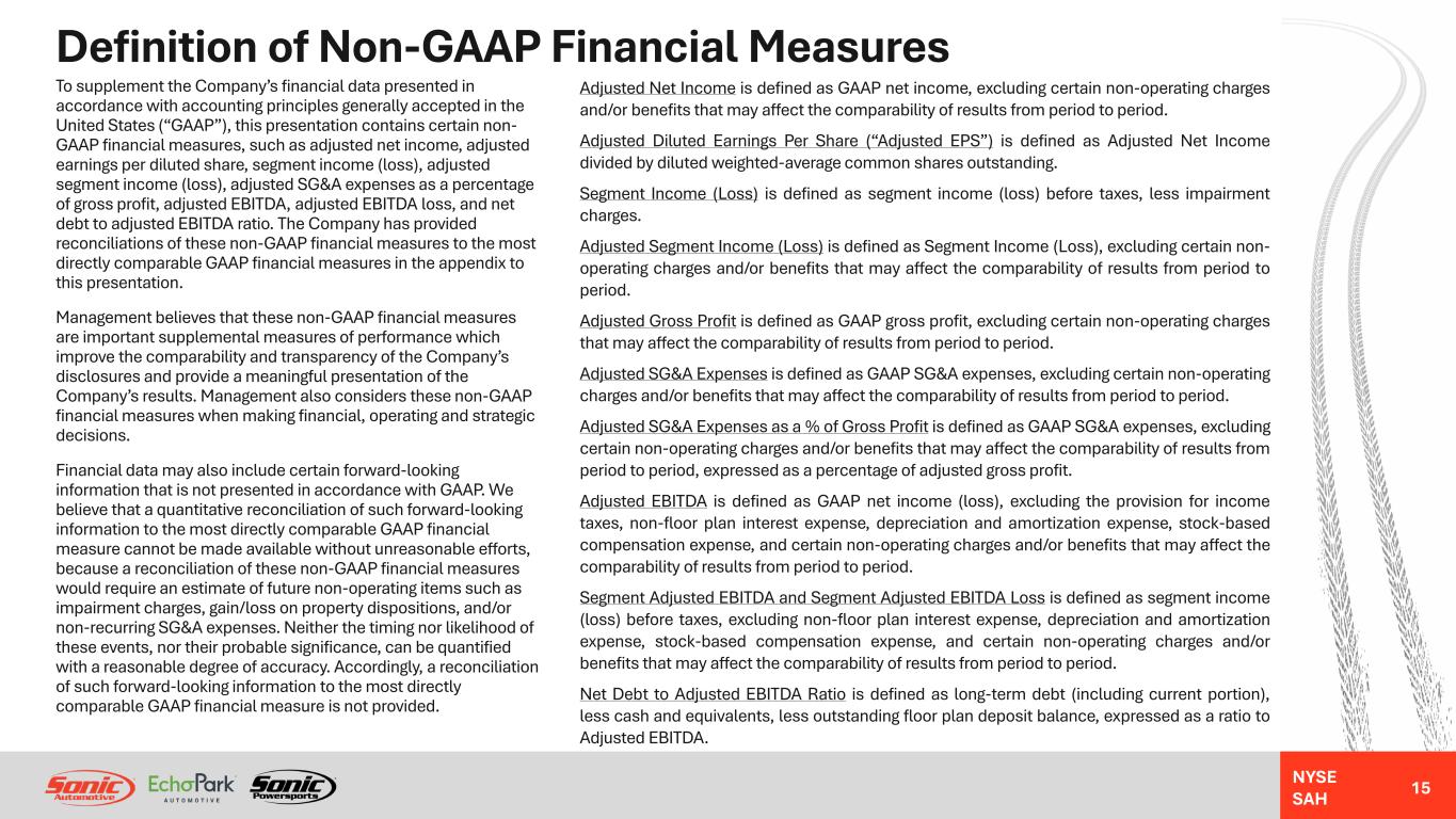 NYSE SAH Definition of Non-GAAP Financial Measures 15 Adjusted Net Income is defined as GAAP net income, excluding certain non-operating charges and/or benefits that may affect the comparability of results from period to period. Adjusted Diluted Earnings Per Share (“Adjusted EPS”) is defined as Adjusted Net Income divided by diluted weighted-average common shares outstanding. Segment Income (Loss) is defined as segment income (loss) before taxes, less impairment charges. Adjusted Segment Income (Loss) is defined as Segment Income (Loss), excluding certain non- operating charges and/or benefits that may affect the comparability of results from period to period. Adjusted Gross Profit is defined as GAAP gross profit, excluding certain non-operating charges that may affect the comparability of results from period to period. Adjusted SG&A Expenses is defined as GAAP SG&A expenses, excluding certain non-operating charges and/or benefits that may affect the comparability of results from period to period. Adjusted SG&A Expenses as a % of Gross Profit is defined as GAAP SG&A expenses, excluding certain non-operating charges and/or benefits that may affect the comparability of results from period to period, expressed as a percentage of adjusted gross profit. Adjusted EBITDA is defined as GAAP net income (loss), excluding the provision for income taxes, non-floor plan interest expense, depreciation and amortization expense, stock-based compensation expense, and certain non-operating charges and/or benefits that may affect the comparability of results from period to period. Segment Adjusted EBITDA and Segment Adjusted EBITDA Loss is defined as segment income (loss) before taxes, excluding non-floor plan interest expense, depreciation and amortization expense, stock-based compensation expense, and certain non-operating charges and/or benefits that may affect the comparability of results from period to period. Net Debt to Adjusted EBITDA Ratio is defined as long-term debt (including current portion), less cash and equivalents, less outstanding floor plan deposit balance, expressed as a ratio to Adjusted EBITDA. To supplement the Company’s financial data presented in accordance with accounting principles generally accepted in the United States (“GAAP”), this presentation contains certain non- GAAP financial measures, such as adjusted net income, adjusted earnings per diluted share, segment income (loss), adjusted segment income (loss), adjusted SG&A expenses as a percentage of gross profit, adjusted EBITDA, adjusted EBITDA loss, and net debt to adjusted EBITDA ratio. The Company has provided reconciliations of these non-GAAP financial measures to the most directly comparable GAAP financial measures in the appendix to this presentation. Management believes that these non-GAAP financial measures are important supplemental measures of performance which improve the comparability and transparency of the Company’s disclosures and provide a meaningful presentation of the Company’s results. Management also considers these non-GAAP financial measures when making financial, operating and strategic decisions. Financial data may also include certain forward-looking information that is not presented in accordance with GAAP. We believe that a quantitative reconciliation of such forward-looking information to the most directly comparable GAAP financial measure cannot be made available without unreasonable efforts, because a reconciliation of these non-GAAP financial measures would require an estimate of future non-operating items such as impairment charges, gain/loss on property dispositions, and/or non-recurring SG&A expenses. Neither the timing nor likelihood of these events, nor their probable significance, can be quantified with a reasonable degree of accuracy. Accordingly, a reconciliation of such forward-looking information to the most directly comparable GAAP financial measure is not provided.