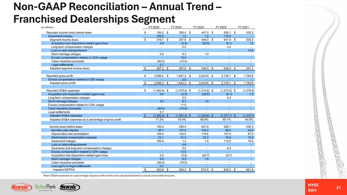 NYSE SAH GAAP Income Statement – Annual Trend – Franchised Dealerships Segment 20 NM = Not MeaningfulNote: Gross profit per unit metrics are calculated based on actual unrounded amounts. FY 2025 Better / (Worse) % Change (In millions, except unit and per unit data) FY 2025 FY 2024 FY 2023 FY 2022 FY 2021 Year-Over-Year Revenues: Retail new vehicles 6,941.9$ 6,425.5$ 6,215.0$ 5,581.6$ 4,984.4$ 8% Fleet new vehicles 101.5 95.3 92.2 99.4 124.6 NM Total new vehicles 7,043.4 6,520.8 6,307.2 5,681.0 5,109.0 8% Used vehicles 3,087.0 2,919.8 3,050.3 3,391.5 2,901.0 6% Wholesale vehicles 207.0 188.9 204.5 314.0 257.2 NM Total vehicles 10,337.4 9,629.5 9,562.0 9,386.5 8,267.2 7% Parts, service and collision repair 1,970.2 1,802.9 1,714.2 1,588.0 1,340.4 9% Finance, insurance and other, net ("F&I") 571.5 506.8 498.6 510.1 443.5 13% Total revenues 12,879.1 11,939.2 11,774.8 11,484.6 10,051.1 8% Gross profit: Retail new vehicles 367.6 376.9 518.7 655.3 458.8 (2%) Fleet new vehicles 1.7 3.0 4.0 4.9 1.5 NM Total new vehicles 369.3 379.9 522.7 660.2 460.3 (3%) Used vehicles 157.8 150.2 162.9 174.5 188.1 5% Wholesale vehicles (9.3) (4.6) (3.3) (6.4) 0.6 NM Total vehicles 517.8 525.5 682.3 828.3 649.0 (1%) Parts, service and collision repair 1,005.9 908.9 852.7 786.7 673.1 11% Finance, insurance and other, net 571.5 506.8 498.6 510.1 443.5 13% Total gross profit 2,095.2 1,941.2 2,033.6 2,125.1 1,765.6 8% SG&A expenses (1,463.6) (1,375.4) (1,314.6) (1,273.0) (1,076.9) (6%) Impairment charges (165.9) (1.2) (1.0) (115.5) - NM Depreciation and amortization (137.7) (124.4) (112.3) (101.8) (84.8) (11%) Operating income (loss) 328.0 440.2 605.7 634.8 603.9 (26%) Interest expense, floor plan (72.0) (70.6) (49.2) (23.6) (11.8) (2%) Interest expense, other, net (105.9) (112.7) (109.7) (85.1) (46.3) 6% Other income (expense), net 0.1 (0.5) 0.2 - (15.5) NM Income (loss) before taxes 150.2$ 256.4$ 447.0$ 526.1$ 530.3$ (41%) Unit sales volume: Retail new vehicles 115,981 111,450 107,257 99,424 99,815 4% Fleet new vehicles 1,991 1,805 2,000 2,115 3,543 10% Used vehicles 104,202 101,976 100,210 108,512 105,457 2% Wholesale vehicles 22,868 21,018 20,602 24,052 25,128 9% Gross profit per unit ("GPU"): Retail new vehicles 3,170$ 3,382$ 4,836$ 6,591$ 4,595$ (6%) Used vehicles 1,514$ 1,473$ 1,626$ 1,607$ 1,784$ 3% F&I 2,596$ 2,374$ 2,403$ 2,453$ 2,160$ 9%