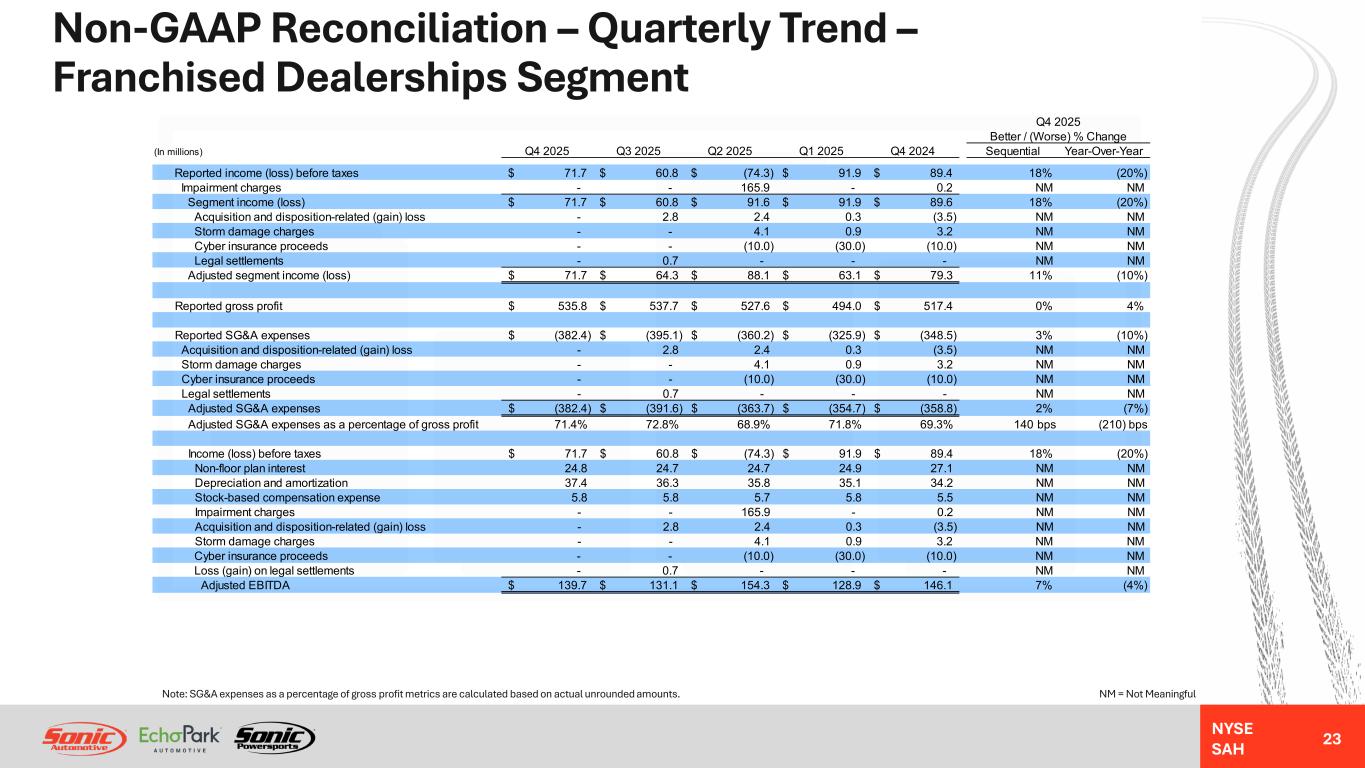 NYSE SAH GAAP Income Statement – Quarterly Trend – Franchised Dealerships Segment 22 NM = Not MeaningfulNote: Gross profit per unit metrics are calculated based on actual unrounded amounts. Q4 2025 Better / (Worse) % Change (In millions, except unit and per unit data) Q4 2025 Q3 2025 Q2 2025 Q1 2025 Q4 2024 Sequential Year-Over-Year Revenues: Retail new vehicles 1,831.8$ 1,834.0$ 1,639.1$ 1,636.9$ 1,914.8$ 0% (4%) Fleet new vehicles 24.0 26.0 29.5 22.1 27.2 NM NM Total new vehicles 1,855.8 1,860.0 1,668.6 1,659.0 1,942.0 0% (4%) Used vehicles 799.7 796.7 744.9 745.6 757.0 0% 6% Wholesale vehicles 41.8 52.8 57.8 54.6 49.8 NM NM Total vehicles 2,697.3 2,709.5 2,471.3 2,459.2 2,748.8 0% (2%) Parts, service and collision repair 507.8 510.1 484.9 467.4 469.7 0% 8% Finance, insurance and other, net ("F&I") 149.1 147.6 144.3 130.6 140.5 1% 6% Total revenues 3,354.2 3,367.2 3,100.5 3,057.2 3,359.0 0% 0% Gross profit: Retail new vehicles 94.3 91.3 95.2 86.7 104.4 3% (10%) Fleet new vehicles 0.7 - 0.6 0.6 0.7 NM NM Total new vehicles 95.0 91.3 95.8 87.3 105.1 4% (10%) Used vehicles 38.1 40.4 39.5 39.9 36.0 (6%) 6% Wholesale vehicles (4.9) (2.9) (0.9) (1.0) (2.7) NM NM Total vehicles 128.2 128.8 134.4 126.2 138.4 (1%) (7%) Parts, service and collision repair 258.5 261.3 248.9 237.2 238.5 (1%) 8% Finance, insurance and other, net 149.1 147.6 144.3 130.6 140.5 1% 6% Total gross profit 535.8 537.7 527.6 494.0 517.4 0% 4% SG&A expenses (382.4) (395.1) (360.2) (325.9) (348.5) 3% (10%) Impairment charges - - (165.9) - (0.2) NM NM Depreciation and amortization (35.6) (34.6) (34.1) (33.4) (32.7) (3%) (9%) Operating income (loss) 117.8 108.0 (32.6) 134.7 136.0 9% (13%) Interest expense, floor plan (19.6) (20.7) (15.3) (16.3) (18.0) 5% (9%) Interest expense, other, net (26.5) (26.4) (26.3) (26.6) (28.6) 0% 7% Other income (expense), net - (0.1) (0.1) 0.1 - NM NM Income (loss) before taxes 71.7$ 60.8$ (74.3)$ 91.9$ 89.4$ 18% (20%) Unit sales volume: Retail new vehicles 29,400 30,415 28,084 28,082 32,250 (3%) (9%) Fleet new vehicles 458 579 571 383 506 (21%) (9%) Used vehicles 27,401 26,407 24,953 25,441 25,702 4% 7% Wholesale vehicles 4,811 5,649 6,213 6,195 5,692 (15%) (15%) Gross profit per unit ("GPU"): Retail new vehicles 3,209$ 3,001$ 3,391$ 3,089$ 3,238$ 7% (1%) Used vehicles 1,389$ 1,528$ 1,583$ 1,568$ 1,401$ (9%) (1%) F&I 2,624$ 2,597$ 2,721$ 2,439$ 2,424$ 1% 8%