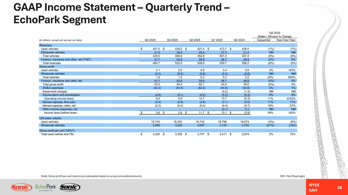 NYSE SAH Non-GAAP Reconciliation – Annual Trend – EchoPark Segment 25 Note: SG&A expenses as a percentage of gross profit metrics are calculated based on actual unrounded amounts. (In millions) FY 2025 FY 2024 FY 2023 FY 2022 FY 2021 Reported income (loss) before taxes 27.9$ 0.8$ (210.8)$ (338.8)$ (72.1)$ Impairment charges 0.2 2.7 78.3 204.9 0.1 Segment income (loss) 28.1$ 3.5$ (132.5)$ (133.9)$ (72.0)$ Acquisition and disposition-related (gain) loss (0.9) (2.1) 0.3 - - Severance and long-term compensation charges - 2.8 5.1 - 6.5 Loss (gain) on exit of leased dealerships - (3.0) 4.3 - - Used vehicle inventory valuation adjustment - - 10.0 - - Excess compensation related to CDK outage - 0.4 - - - Closed store accrued expenses - 2.1 - - - Adjusted segment income (loss) 27.2$ 3.7$ (112.8)$ (133.9)$ (65.5)$ Reported gross profit 233.9$ 207.9$ 161.8$ 175.1$ 148.8$ Used vehicle inventory valuation adjustment - - 10.0 - - Adjusted gross profit 233.9$ 207.9$ 171.8$ 175.1$ 148.8$ Reported SG&A expenses (172.8)$ (165.7)$ (247.0)$ (269.9)$ (197.8)$ Acquisition and disposition-related (gain) loss (0.9) (2.1) 0.3 - - Severance and long-term compensation charges - 2.8 5.1 - 6.5 Loss (gain) on exit of leased dealerships - (3.0) 4.3 - - Excess compensation related to CDK outage - 0.4 - - - Closed store accrued expenses - 2.1 - - - Adjusted SG&A expenses (173.7)$ (165.5)$ (237.3)$ (269.9)$ (191.3)$ Adjusted SG&A expenses as a percentage of gross profit 74.2% 79.6% 138.2% 154.1% 128.6% Income (loss) before taxes 27.9$ 0.8$ (210.8)$ (338.8)$ (72.1)$ Non-floor plan interest 1.6 2.6 3.2 3.7 1.7 Depreciation and amortization 20.4 21.6 26.6 24.8 16.4 Loss (gain) on exit of leased dealerships - (3.0) 4.3 - - Impairment charges 0.2 2.7 78.3 204.9 0.1 Severance and long-term compensation charges - 2.9 5.1 - 8.0 Excess compensation related to CDK outage - 0.4 - - - Acquisition and disposition-related (gain) loss (0.9) (2.5) 0.3 - (0.4) Closed store accrued expenses - 2.1 - - - Used vehicle inventory valuation adjustment - - 10.0 - - Adjusted EBITDA 49.2$ 27.6$ (83.0)$ (105.4)$ (46.3)$ Adjusted EBITDA - Closed Stores 0.9$ (4.9)$ (33.5)$ (35.3)$ (19.3)$ Adjusted EBITDA - EchoPark Operations (with Holding Company) 48.3 32.5 (49.5) (70.1) (27.0) Adjusted EBITDA - Total EchoPark Segment 49.2$ 27.6$ (83.0)$ (105.4)$ (46.3)$